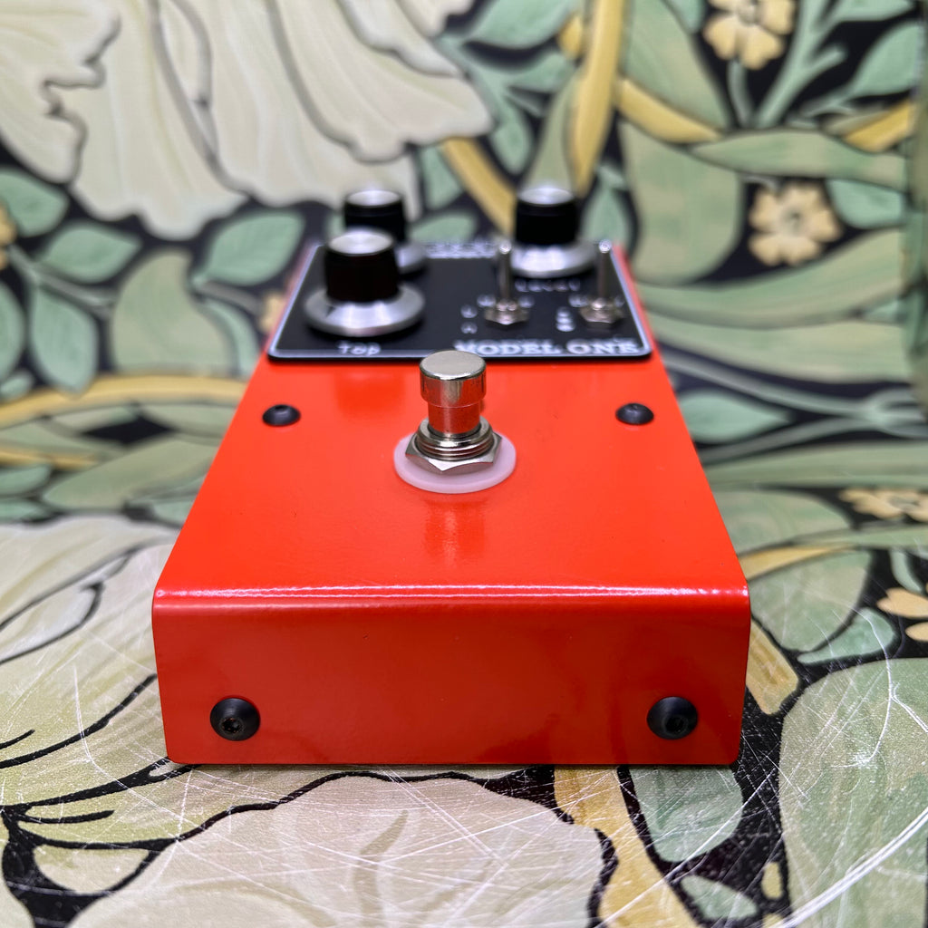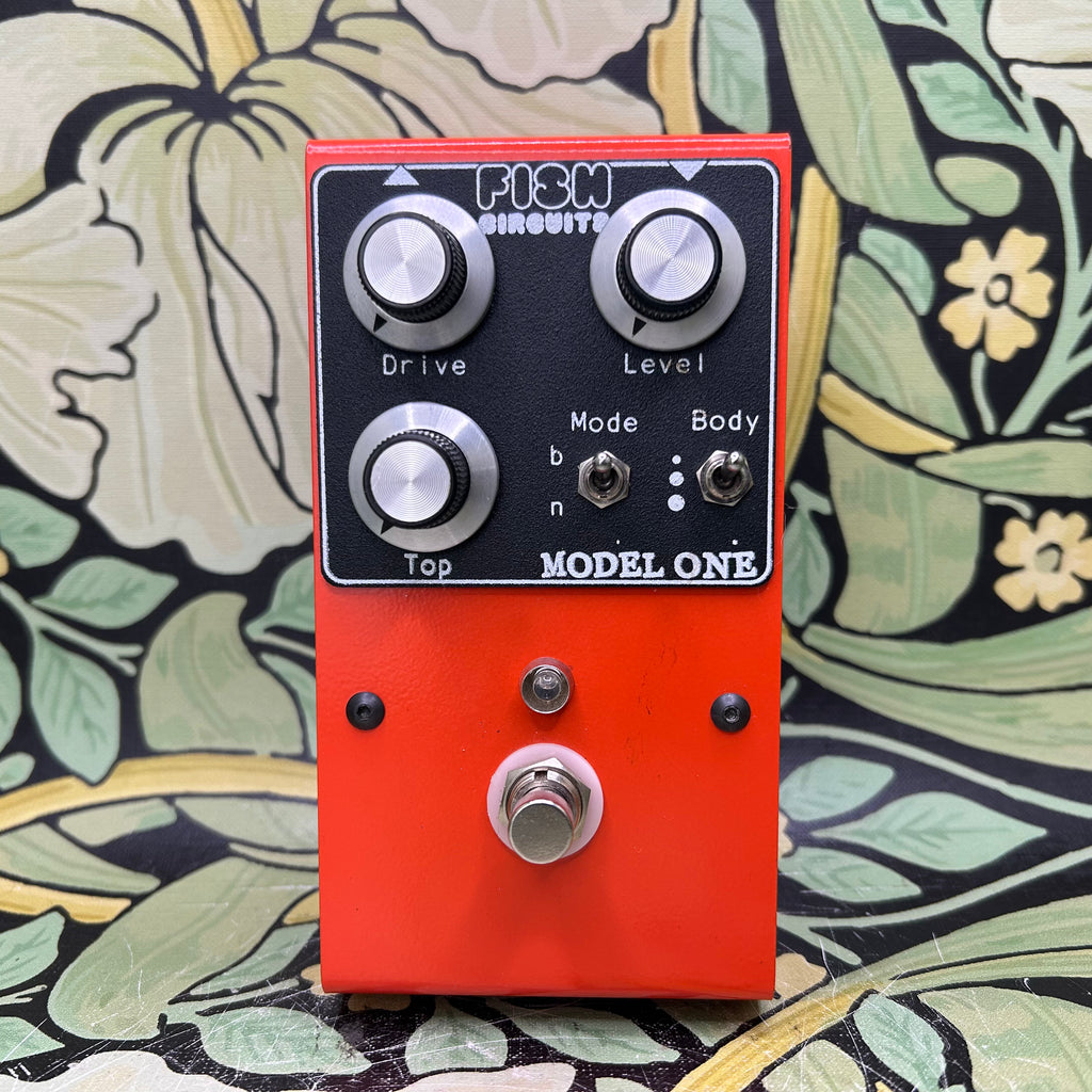 The Fish Circuits MODEL ONE is a classic natural overdrive with spicy tweaks. Incredibly versatile and more than usable on just about any settings. At lower gain settings, the MODEL ONE will give you dynamic amp-like breakup tones, that react to the subtleties of your playing. When cranked, you will find yourself in a saturated « fuzzstortion » territory, with loads of sustain and depth, reminiscent of citrus-colored amps.