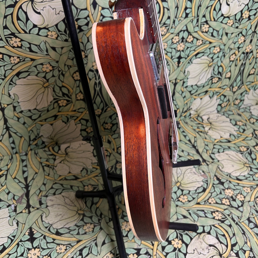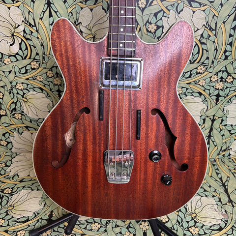 This double cutaway bass guitar features mahogany top and back, and mahogany sides, D shape neck profile with Brazilian rosewood fretboard, measuring 0.890" at the 1st fret and 0.963 at the 12th with a 9.5" radius and nut width of 1.5". The electronics are all stock too! One volume, one tone and a stock Guild BS-1 pickup (14.12k). Altogether weighing in at a breezy 7.08lbs!