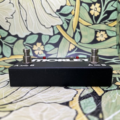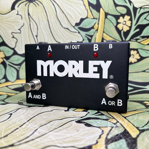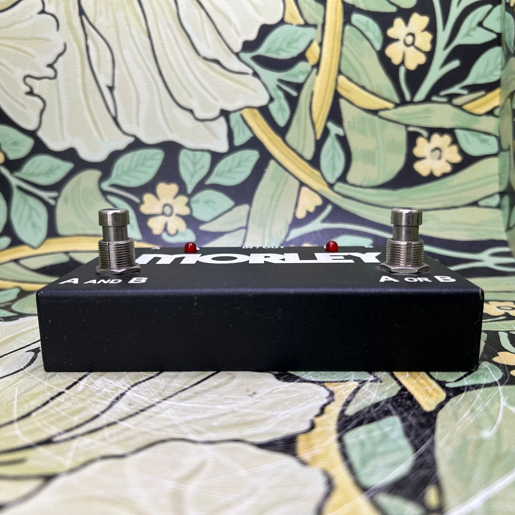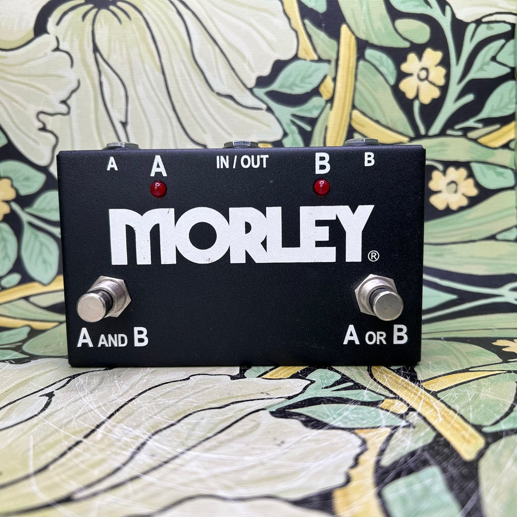Simple and to the point--a switcher for your multi-amp/multi-instrument needs. The Morley ABY selector/combiner footswitch can be employed in a variety of situations; the choice between two inputs/one output, or one input/two outputs gives the user many options. You can, for instance, run a signal to a pair of amps for true stereo effect; switch between two amps for dirty/clean tones (perfect for that old tube amp with separate channels); bypass that noisy boutique stomp box or your entire pedal setup altogether; simultaneously run a keyboard and guitar through your effects chain, and more. Basically, you can route one signal to two outputs or two inputs to one output - then select between them or combine them.