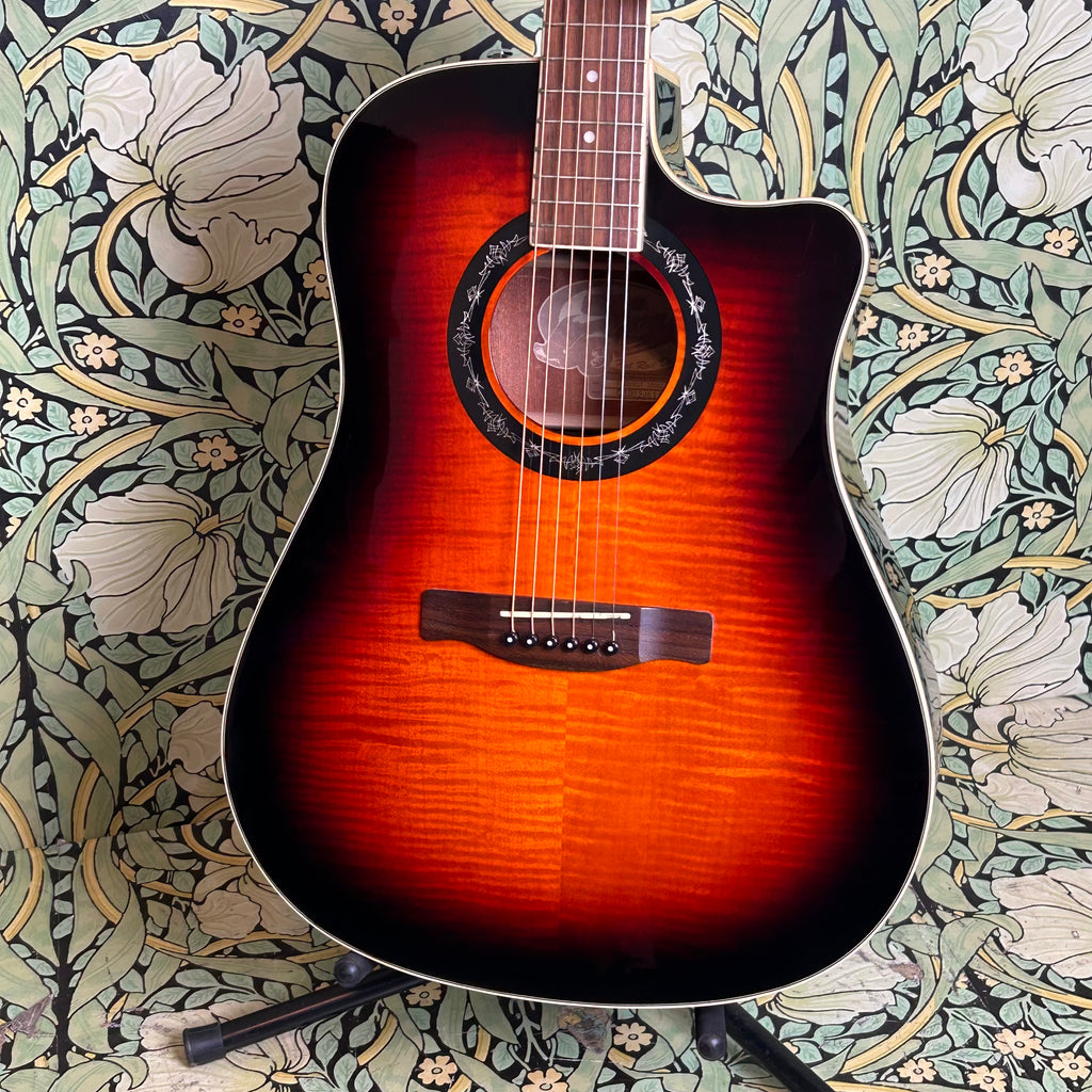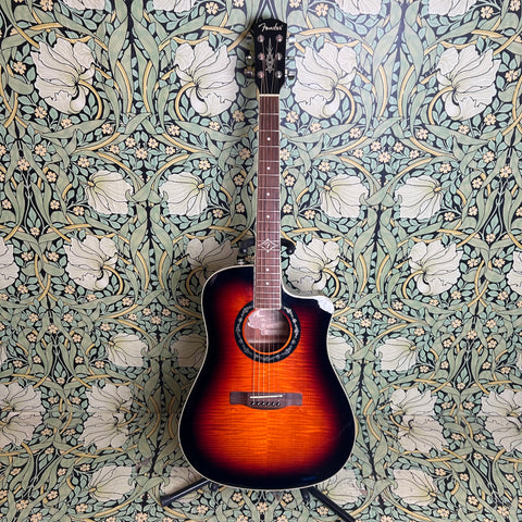 This Fender T-Bucket 300 CE is a single-cutaway dreadnought beauty with a laminated flame maple top and laminated mahogany back and sides.