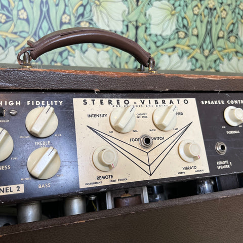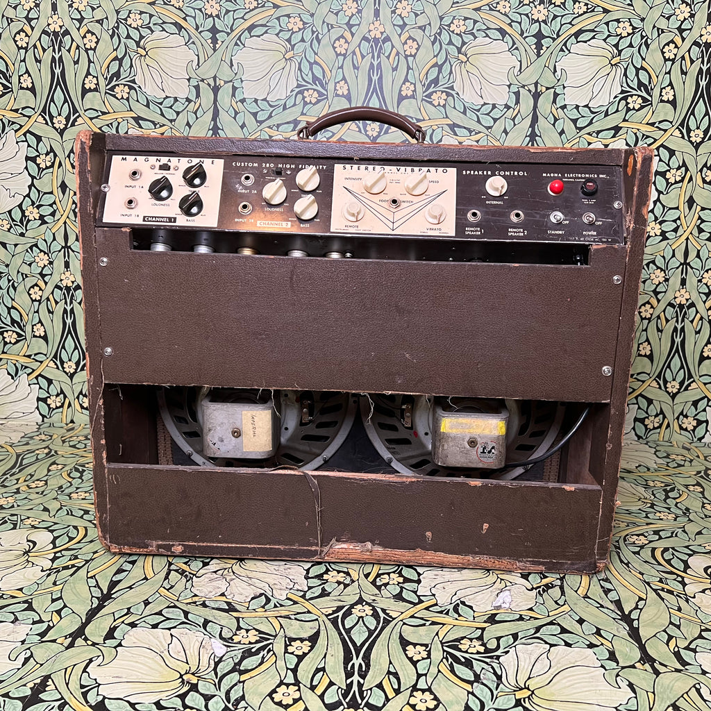 The Model 280 was Magnatone's two channel 50 watt amp (we've got a Model 260 as well...check that one out on our store also!) The 280 is a true tone machine. And don't forget that super groovy iconic four varistor Magnatone vibrato. This thing is just sweet.