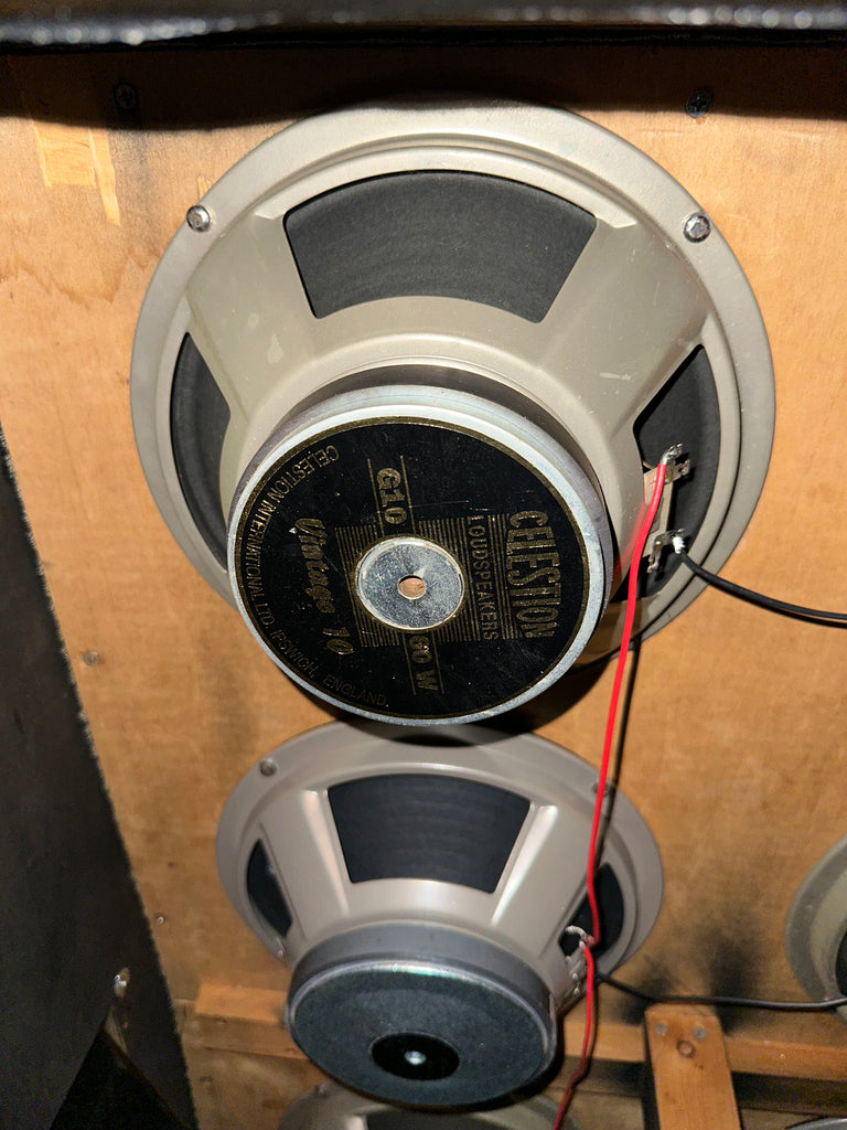 This is straight vintage goodness right here! This cab has been that giant punchy, raucous sound you know and love that's begging for a loud ass head. The highs are chimey, the mids give you all the clarity you need in your tone, and the lows hit just right. This one has been loaded up with a sick complement of 4 original Celestion V10 speakers and 4 60 watt 80th Anniversary Celestion Vintage 10s to give you the perfect blend of vintage warmth and modern clarity.