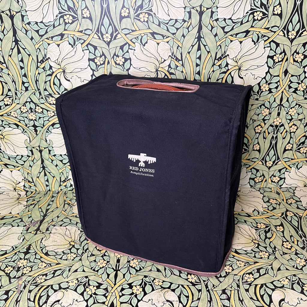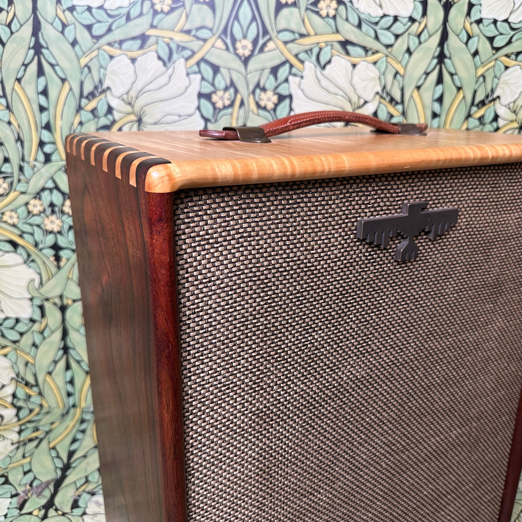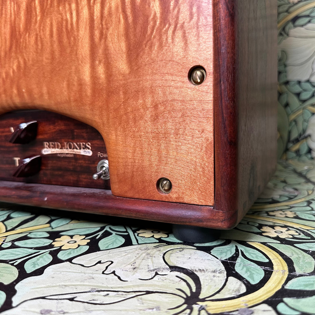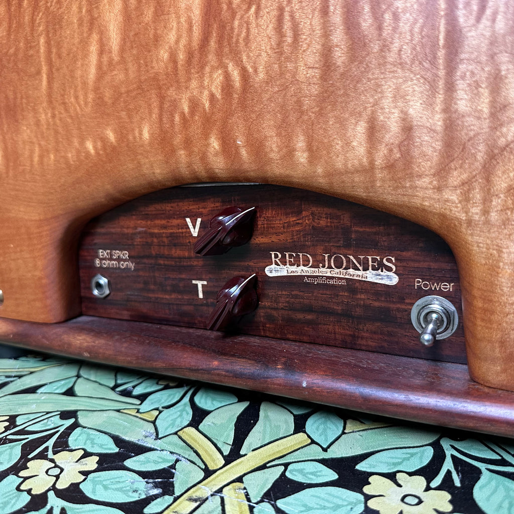 Featuring highly figured maple and rosewood cabinet with dovetail joints, one 10" Celestion G10 Alnico Gold speaker, Mercury Magnetics output transformer, one volume control and one tone control with chickenhead knobs, open back, external speaker output jack, metallic tan grill cloth with Red Jones logo, and brown leather handle.