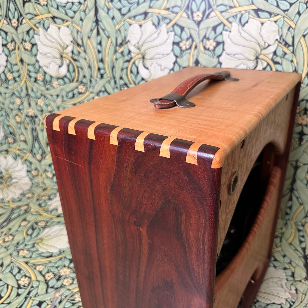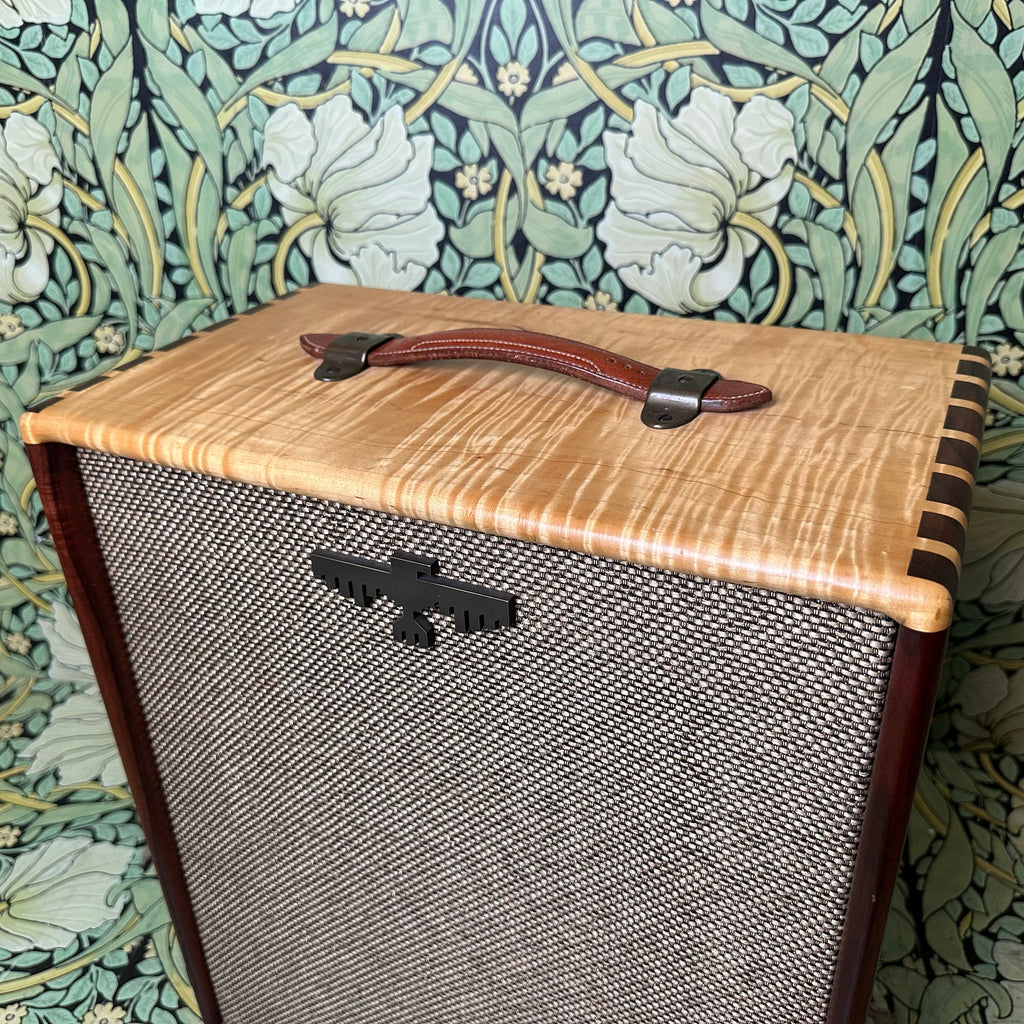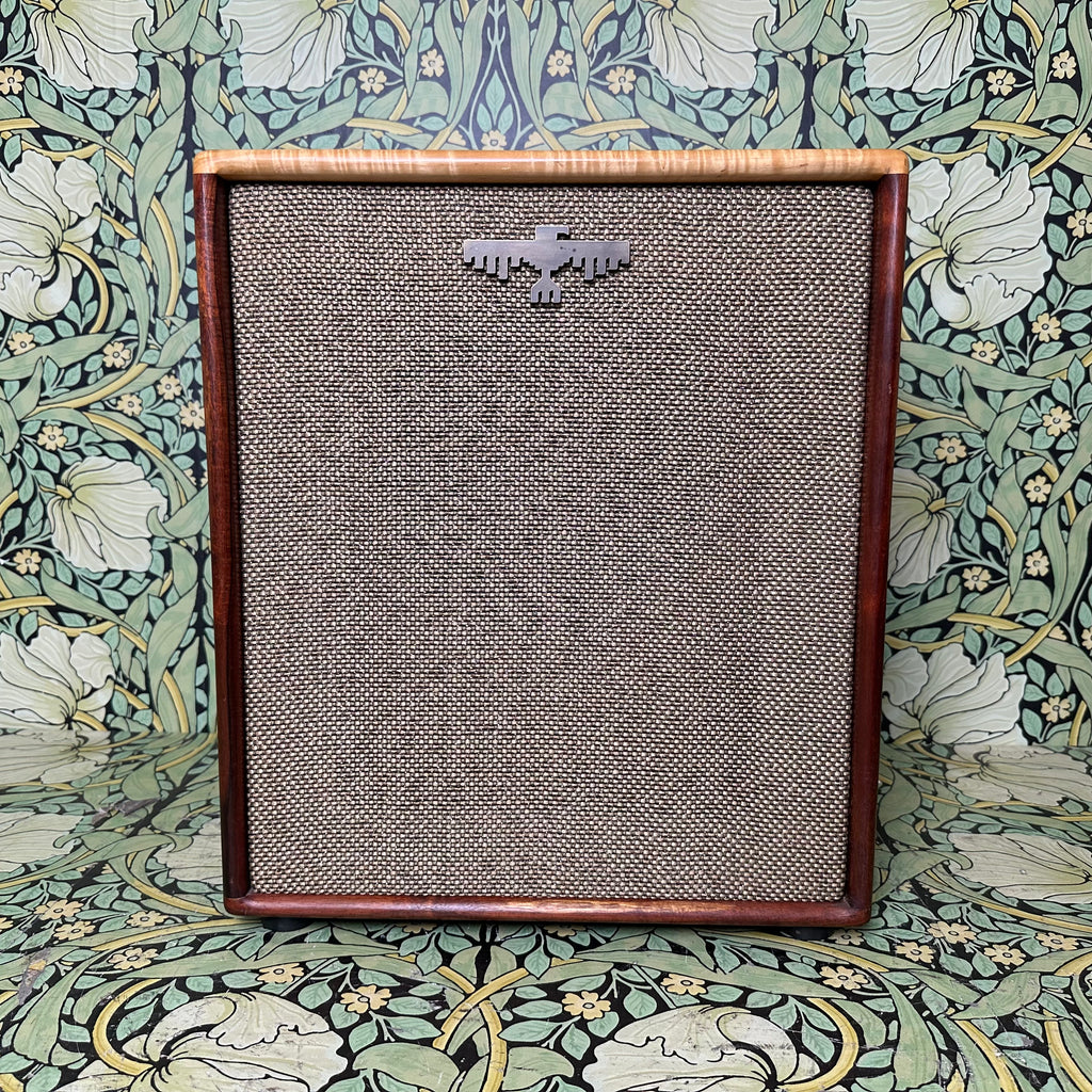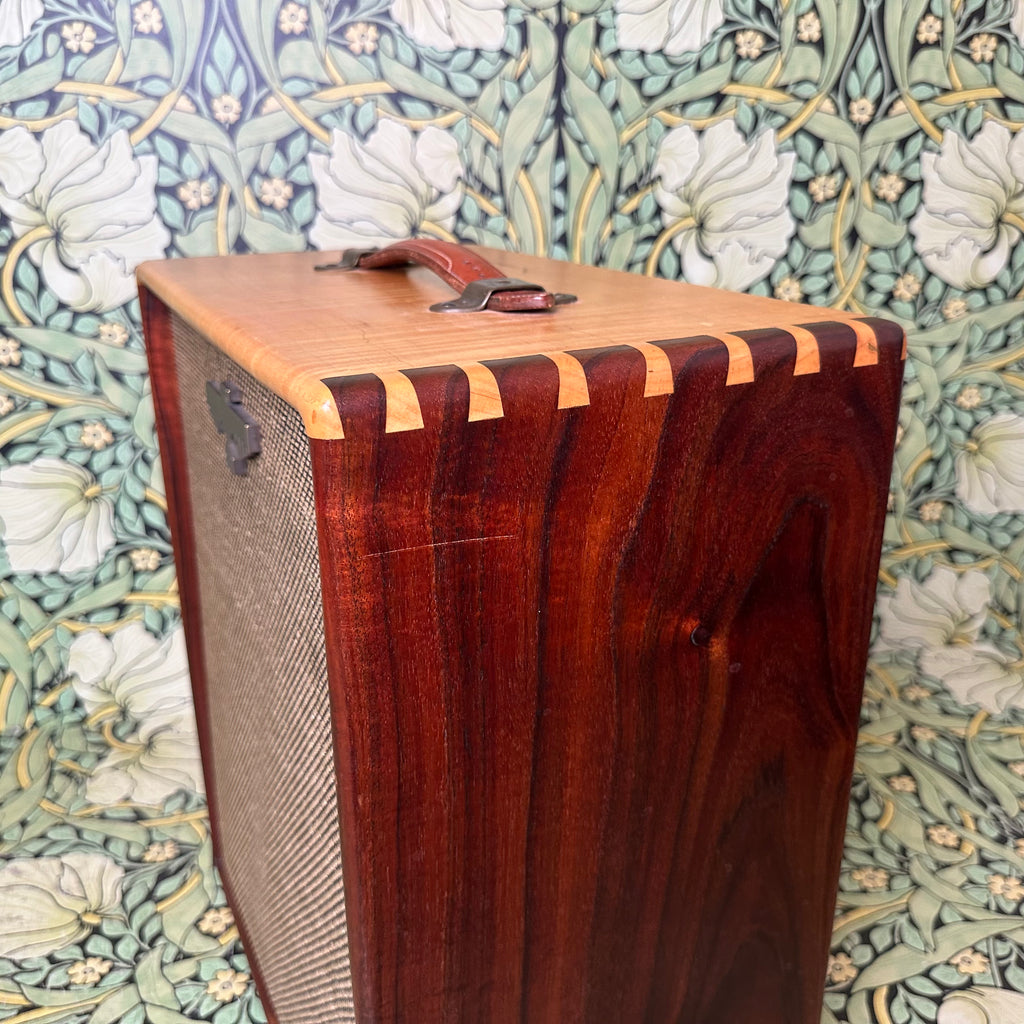 Featuring highly figured maple and rosewood cabinet with dovetail joints, one 10" Celestion G10 Alnico Gold speaker, Mercury Magnetics output transformer, one volume control and one tone control with chickenhead knobs, open back, external speaker output jack, metallic tan grill cloth with Red Jones logo, and brown leather handle.