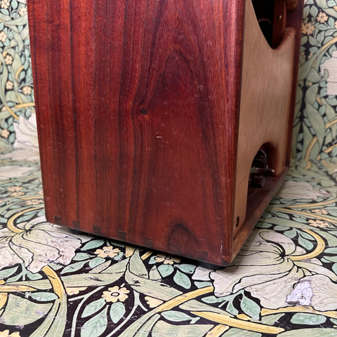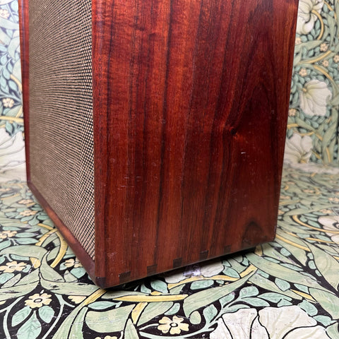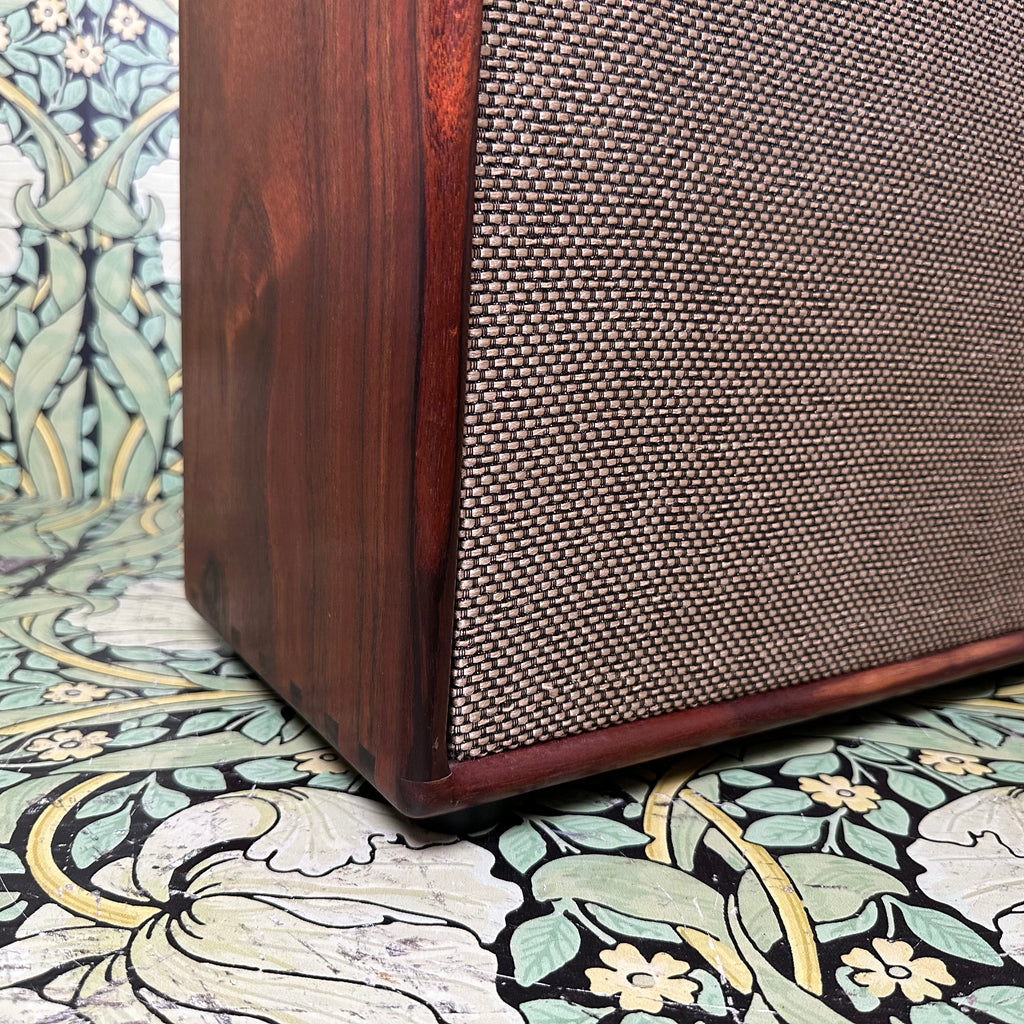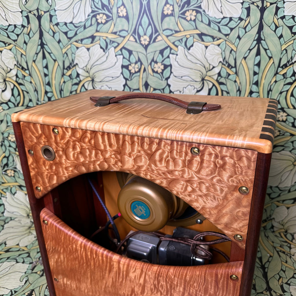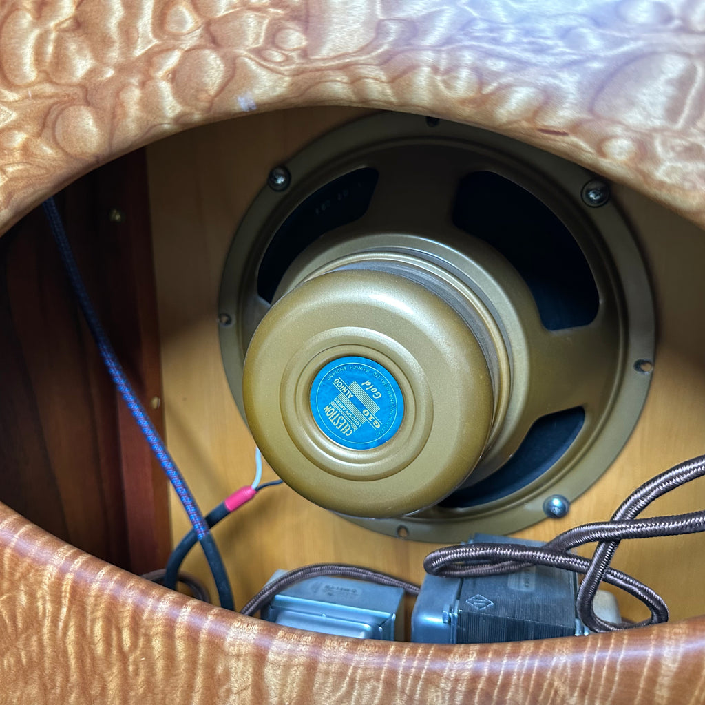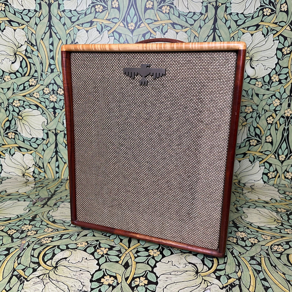 Featuring highly figured maple and rosewood cabinet with dovetail joints, one 10" Celestion G10 Alnico Gold speaker, Mercury Magnetics output transformer, one volume control and one tone control with chickenhead knobs, open back, external speaker output jack, metallic tan grill cloth with Red Jones logo, and brown leather handle.