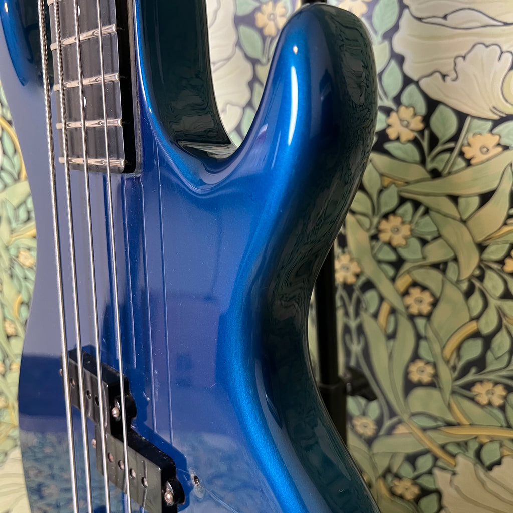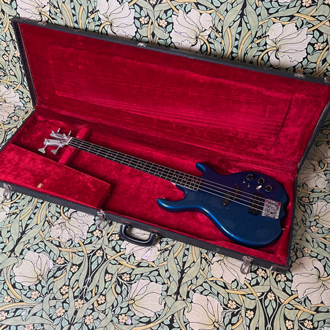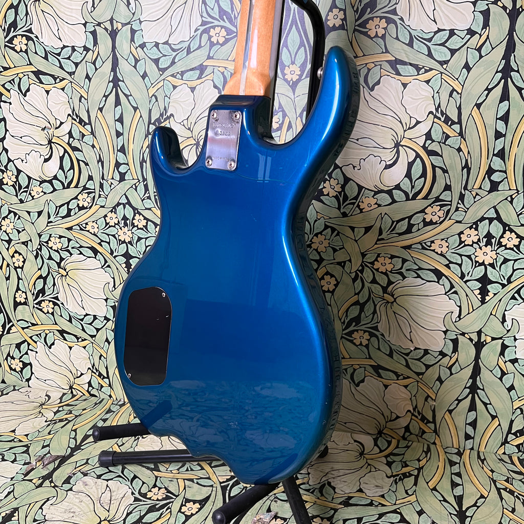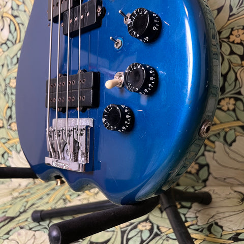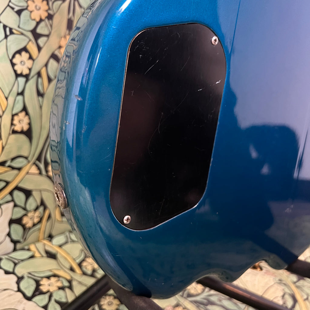 Speaking of things being heavily modified, obviously this bass has been refinished in that metallic electric bass, and we think it looks pretty badass. At some point the previous owner had screwed a pickup cover into the body, causing the finish to crack a bit around that middle pickup, but the crack is purely cosmetic and has not compromised the body at all. This bass clearly shows other signs of use throughout, but these all just contribute to the overall mojo of this player-grade vintage bass.