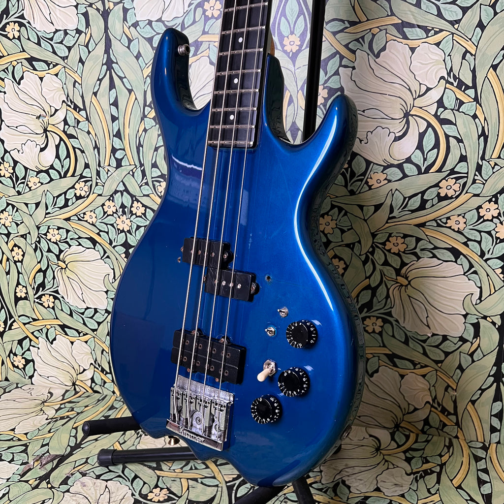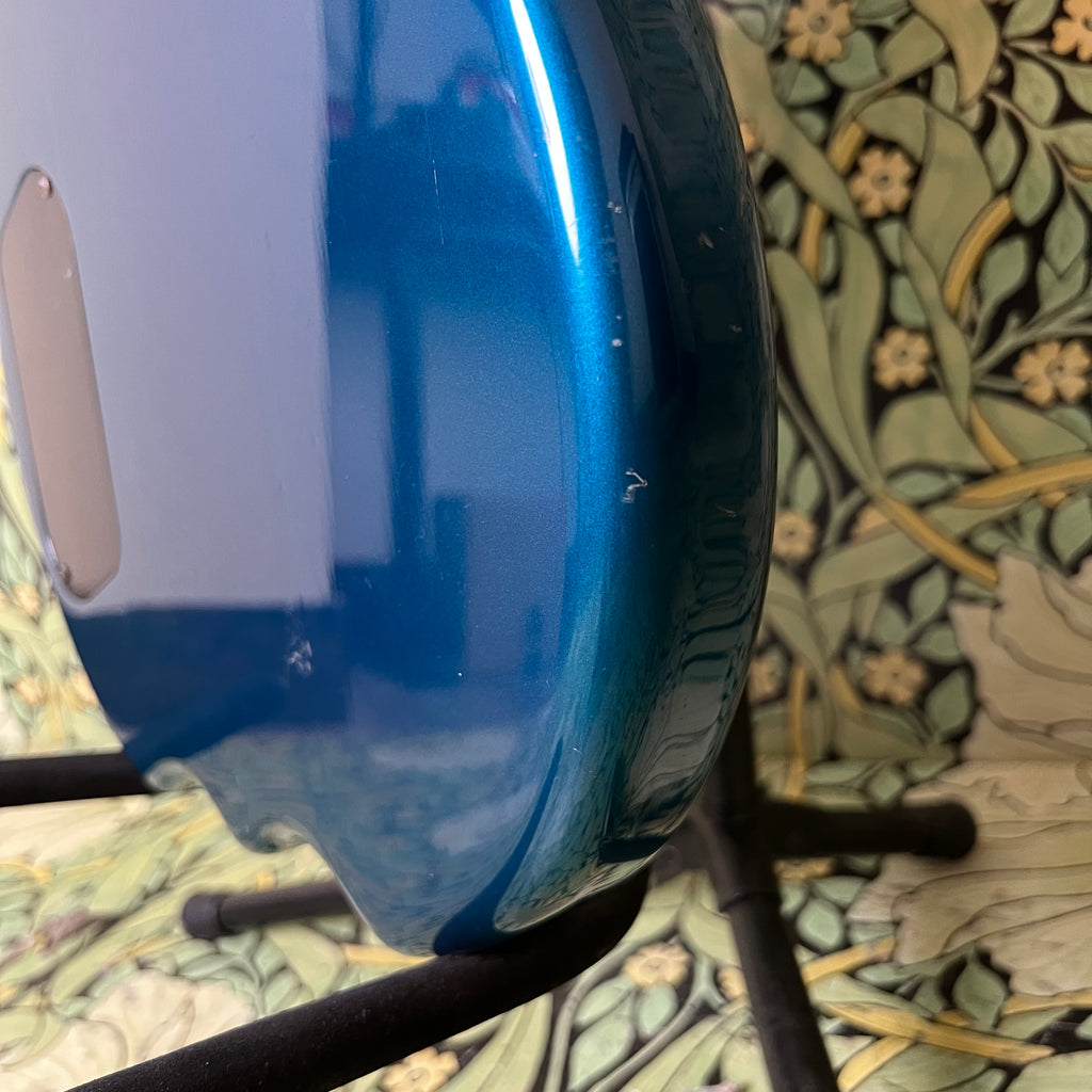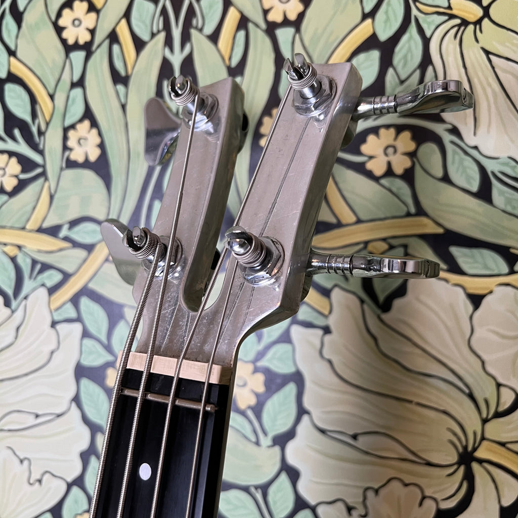 Speaking of things being heavily modified, obviously this bass has been refinished in that metallic electric bass, and we think it looks pretty badass. At some point the previous owner had screwed a pickup cover into the body, causing the finish to crack a bit around that middle pickup, but the crack is purely cosmetic and has not compromised the body at all. This bass clearly shows other signs of use throughout, but these all just contribute to the overall mojo of this player-grade vintage bass.