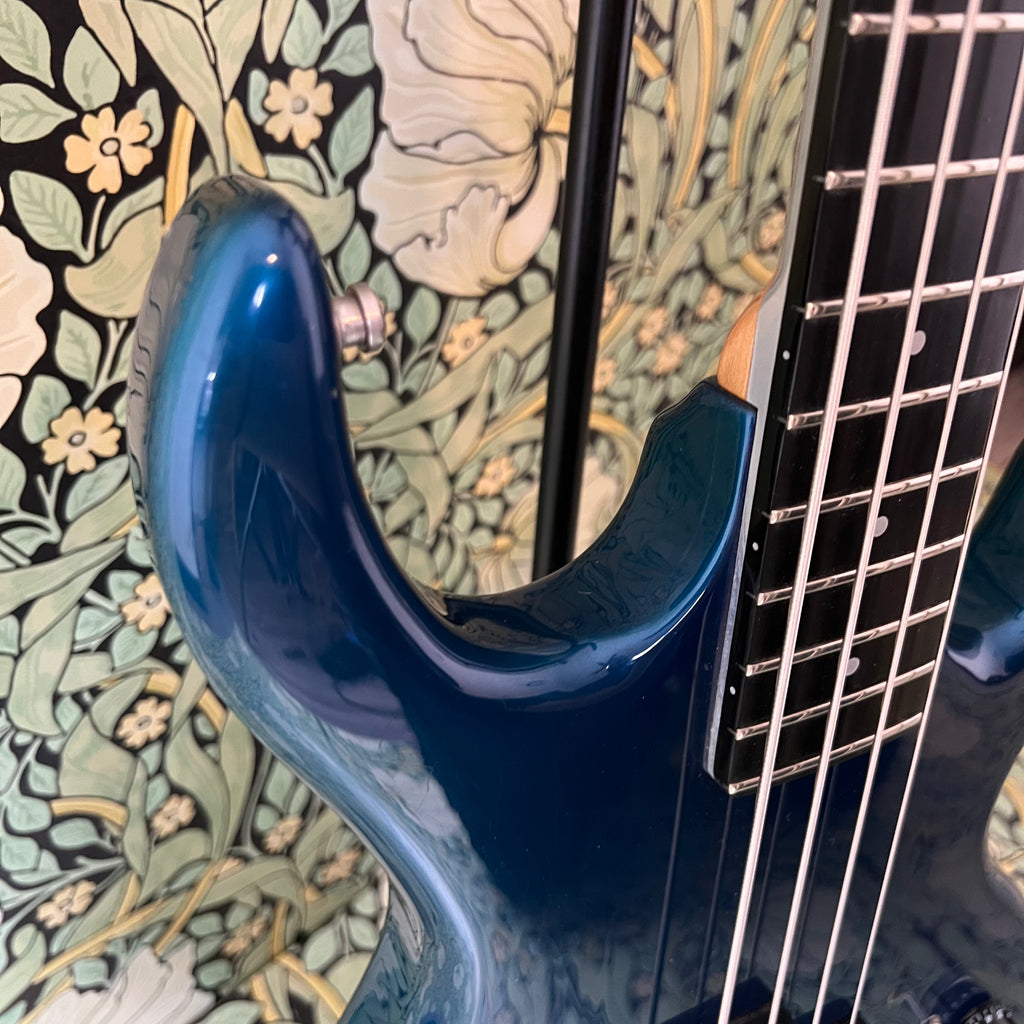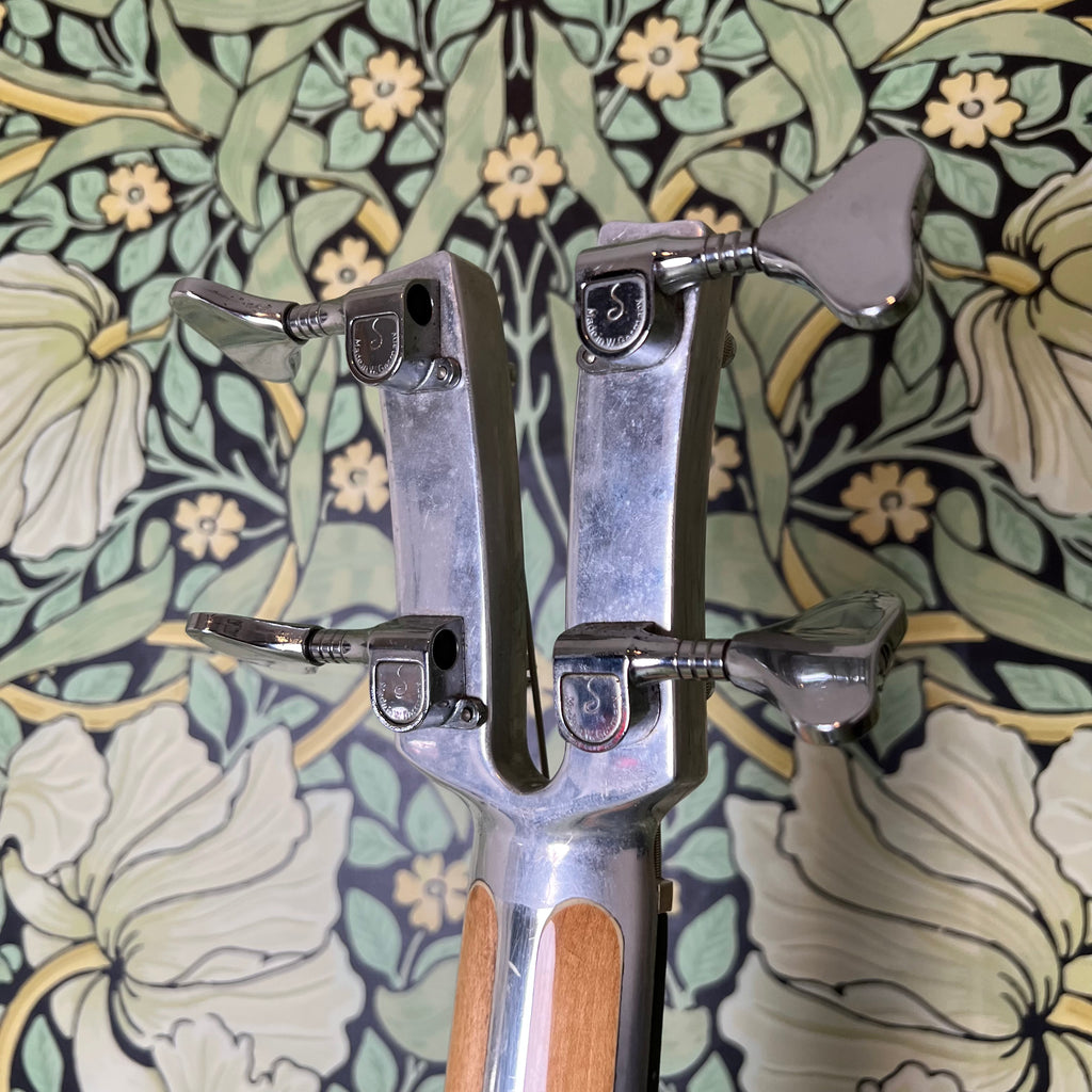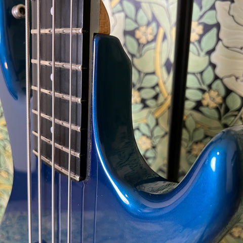 Under the hood, this bass comes loaded up with the stock pickups, controlled by a vast array of knobs and switches for tone options til the cows come home! A volume control for each independent pickup, a master tone control, 3-way pickup selector switch, phase toggle switch, and a series-split-parallel toggle switch. When this bass came to us the electronics had been heavily modified, but our in-house luthiers did the right thing and reverted this bad boy back to stock wiring, the way God intended.