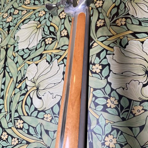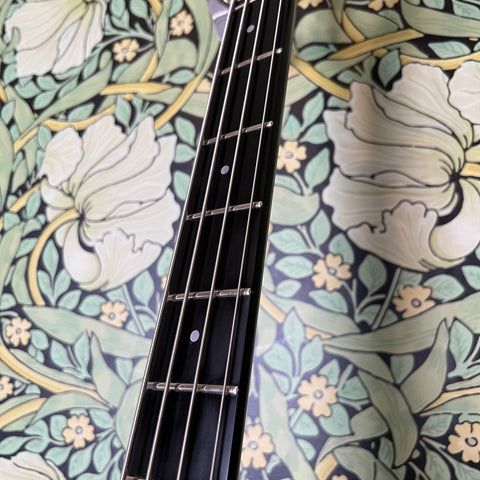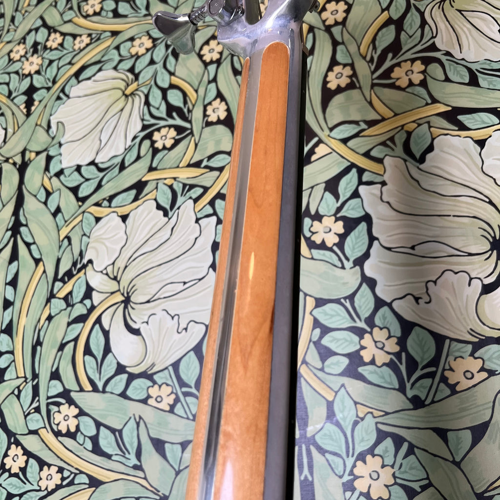The body is made of mahogany and maple, while the neck is constructed of layers of maple laid into aluminum. With a thick-C profile (0.859"-0.975" thickness) and a 14" radius ebony fretboard, the neck on this thing is super comfortable and will sustain for days.