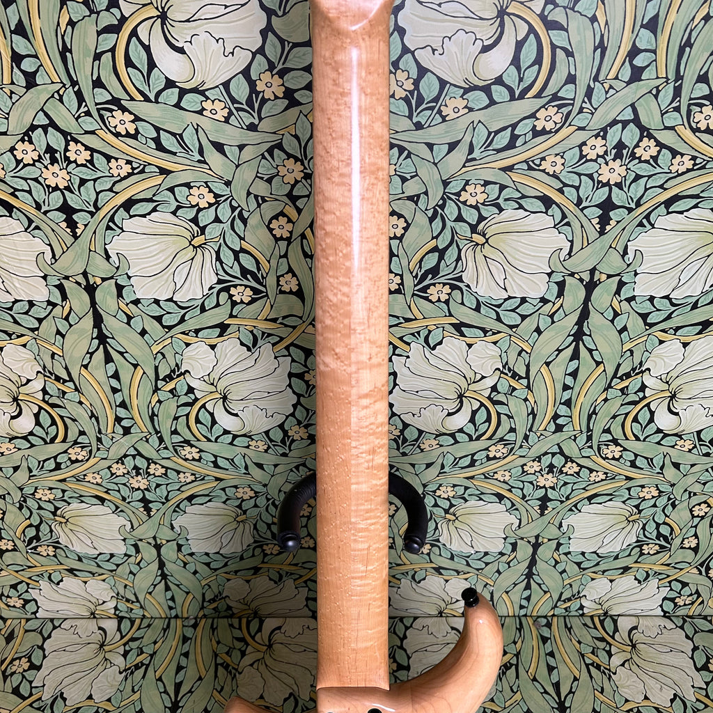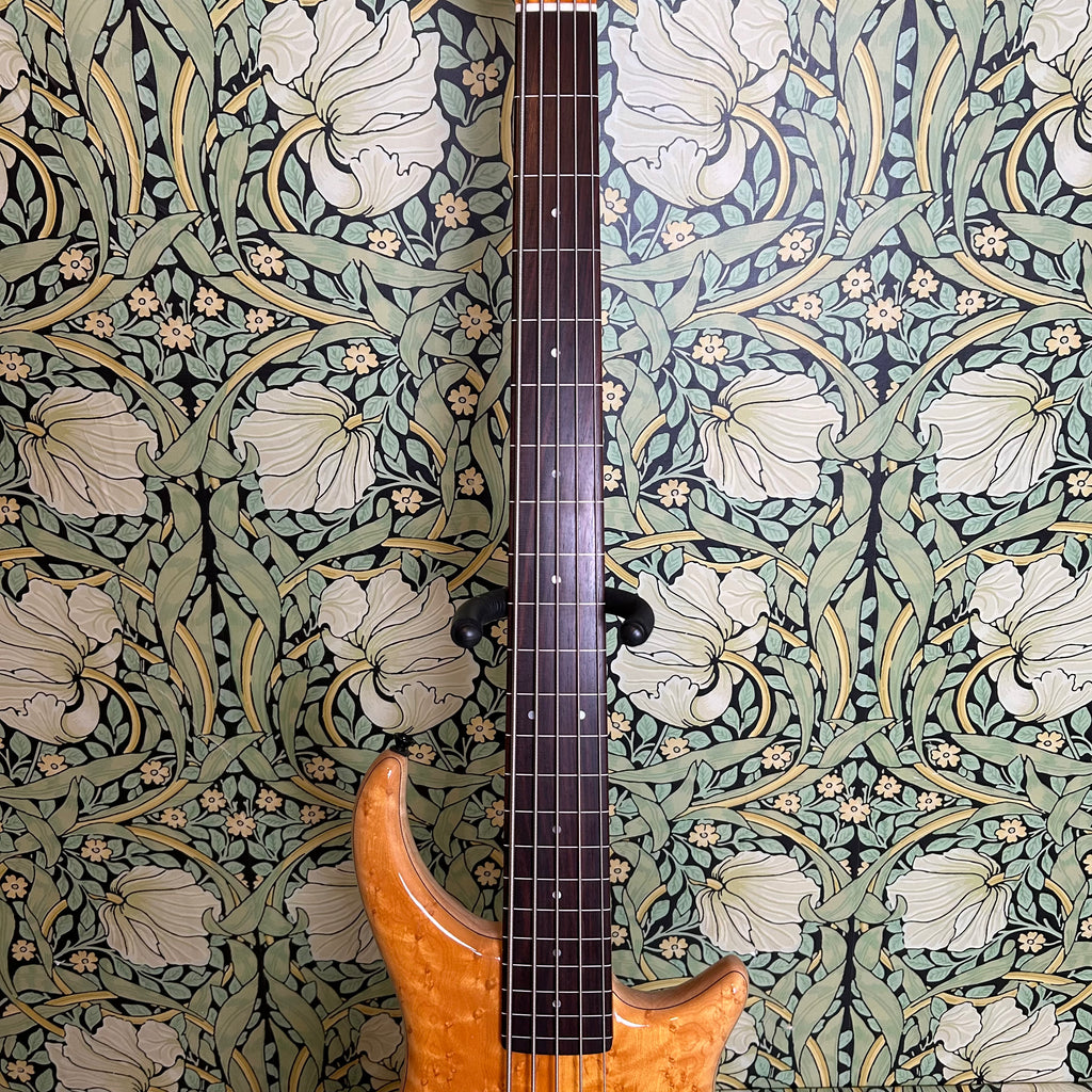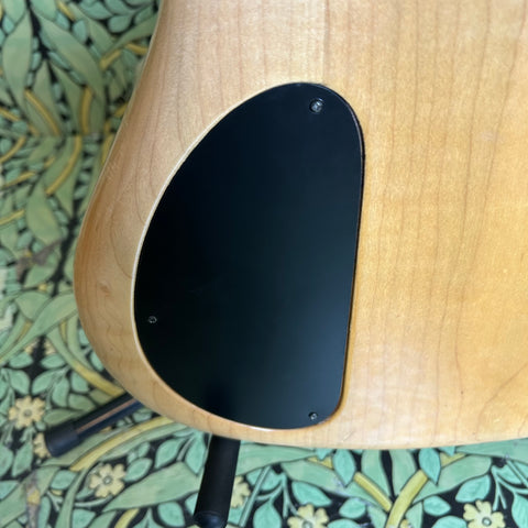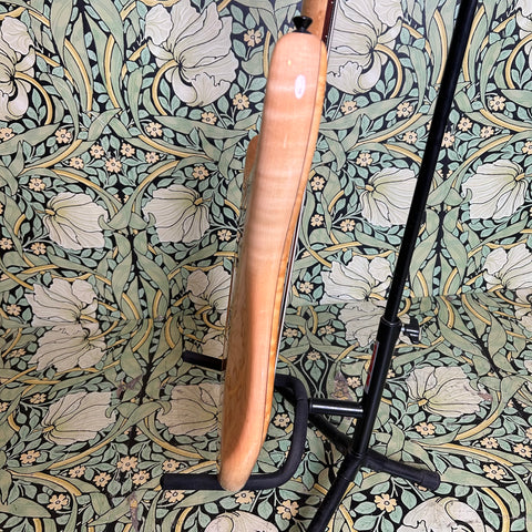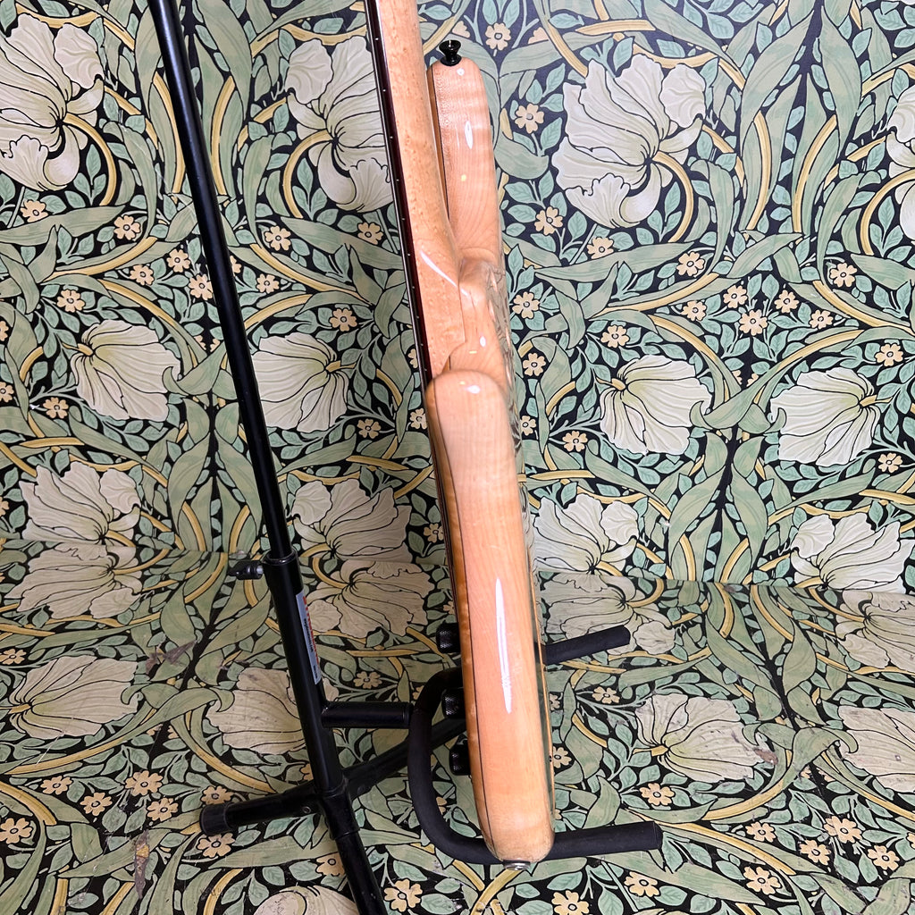 Both constructed of maple, the body features a gorgeous amber top, and the D-profile bolt-on neck has a thickness measuring 0.795" at the 1st fret (or lack thereof) and 0.875" at the 12th. The neck is complemented by a 12" radius rosewood fretboard, or... wait... What do you call a fretboard with no frets? Just a board? Well, regardless, it's got a nut width of 1.885".