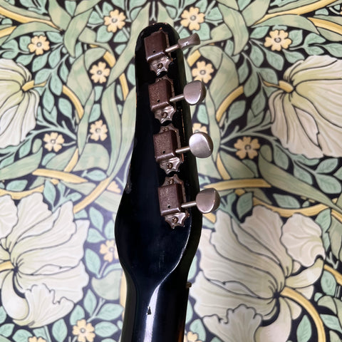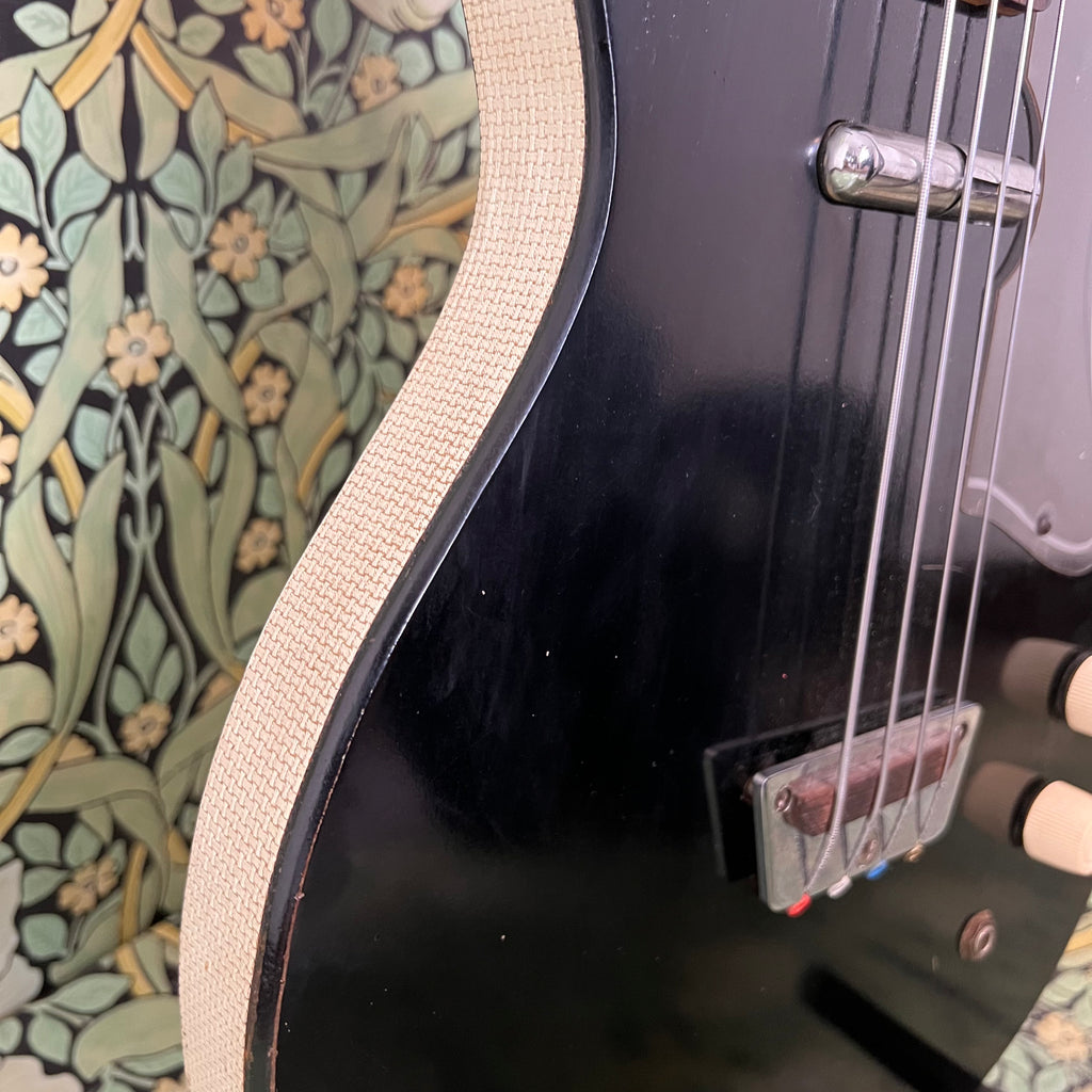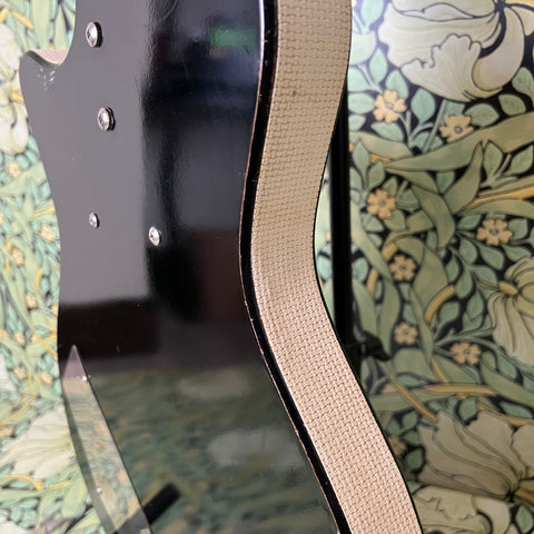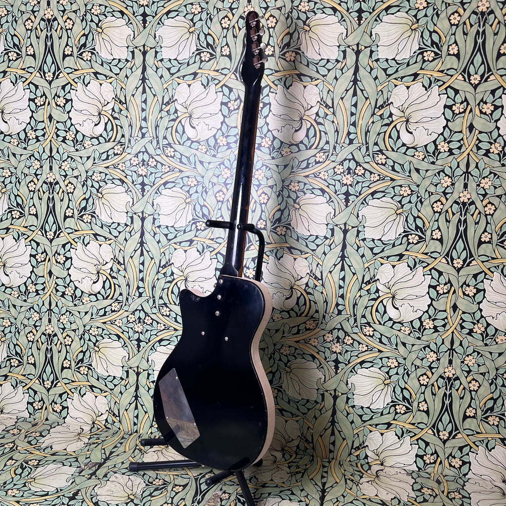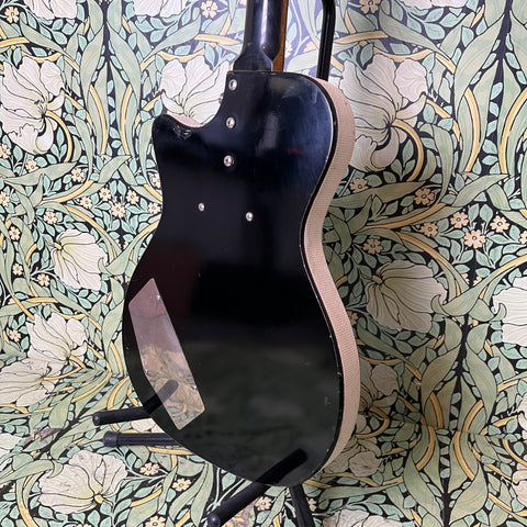 This singlecut lowend master is constructed of masonite, weighing in at a super light 6.14lbs. The maple neck has a C profile with a thickness of 0.825" at the 1st fret and 0.860" at the 12th, and is topped off with a rosewood 16" radius fretboard and a nut width of 1.650"