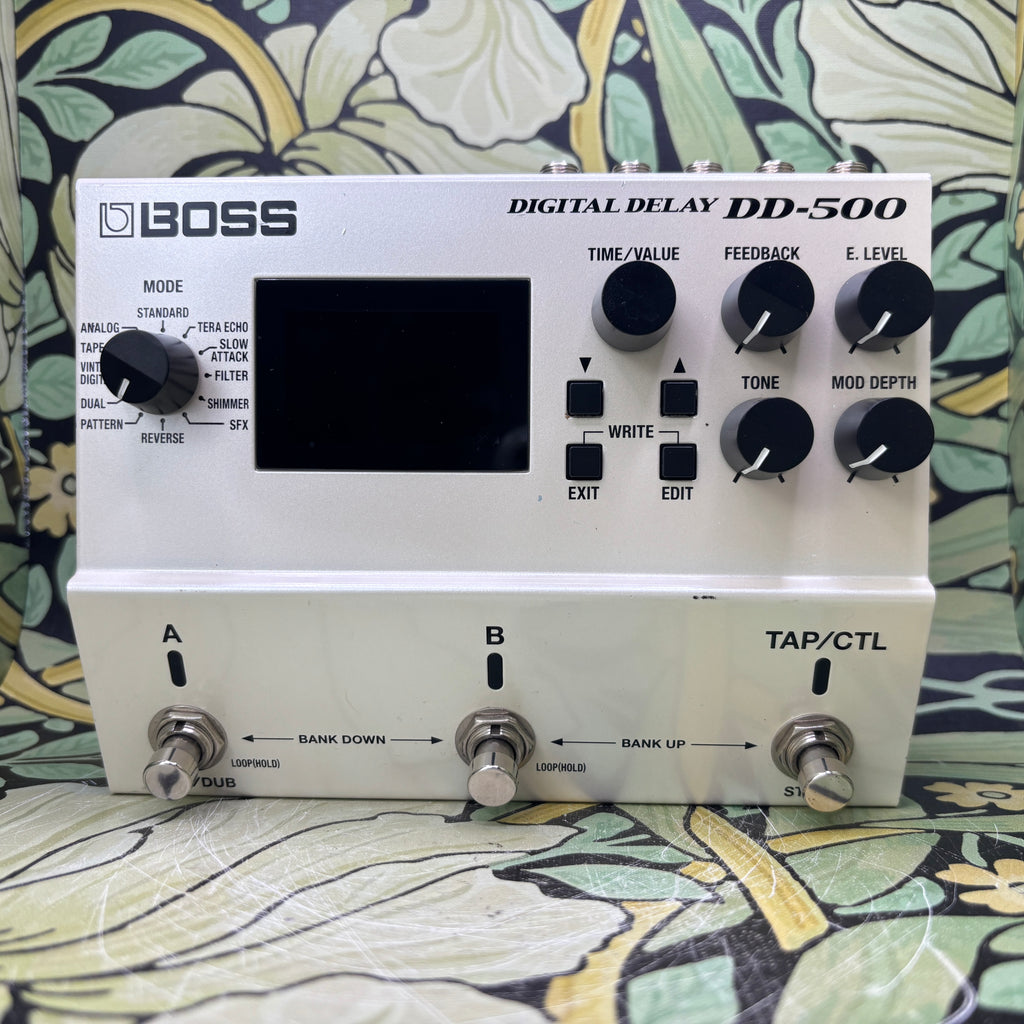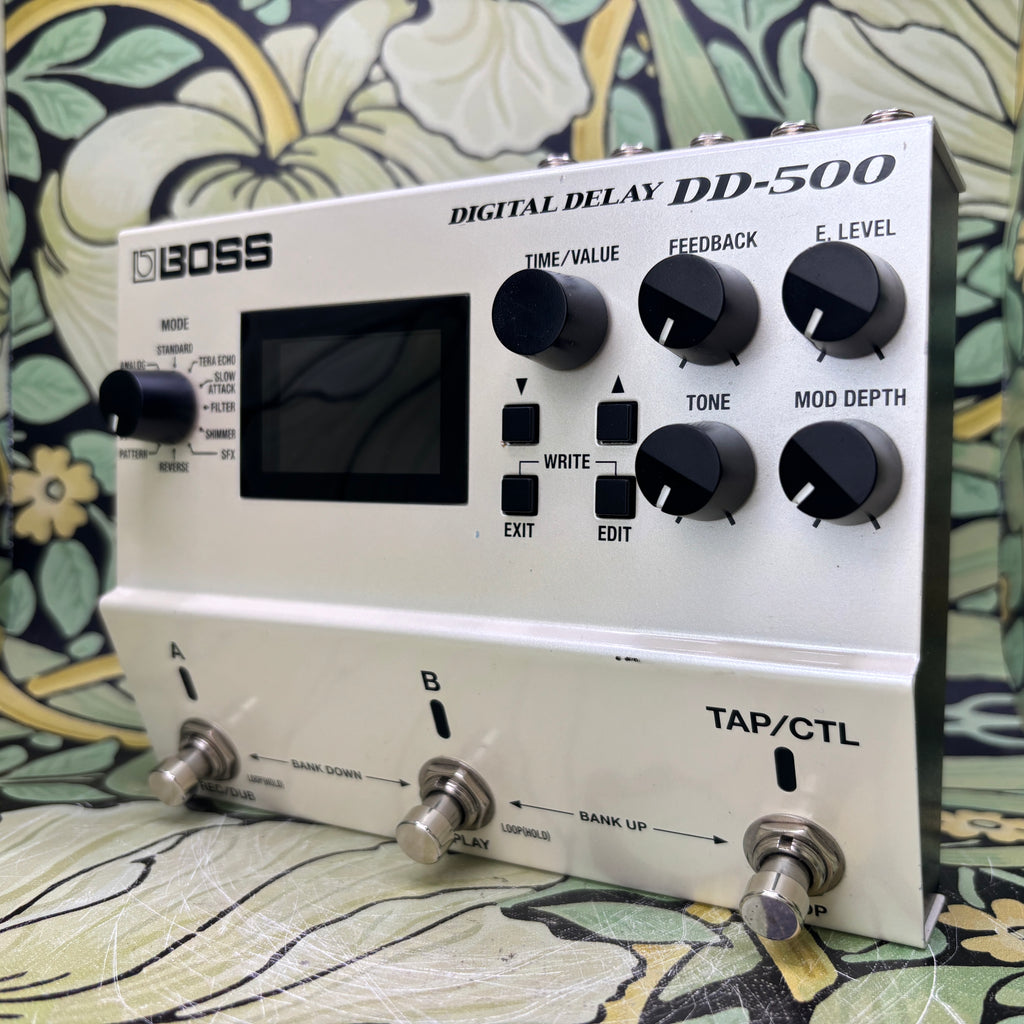 Packed with twelve distinctive, fully editable delay modes, the BOSS DD-500 digital delay pedal provides you with unlimited creative possibilities. The DD-500 also gives you a graphic display that's incredibly easy to follow while performing and editing, onboard patch memories for storing your favorite effect configurations, a phrase looper for creating mind-blowing layered performances, and customizable control settings for real-time expression that's second-to-none. And with 32-bit/96kHz processing throughout, you can expect studio-level sound every time you stomp on the DD-500.