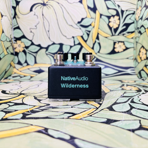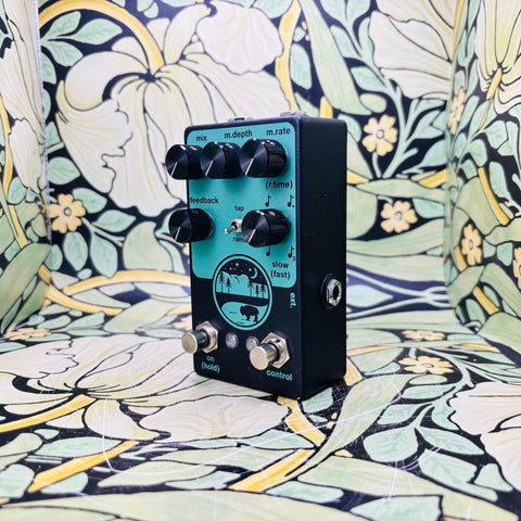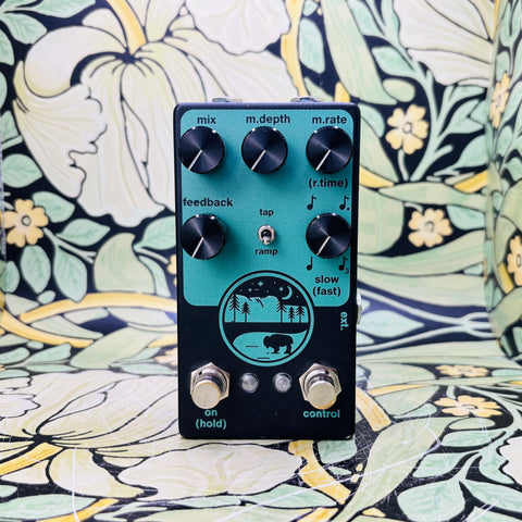 The Wilderness is an analog-voiced delay with up to 1000 milliseconds of delay time. The Wilderness offers feedback, mix, and modulation controls that are global to its two modes: tap and ramp. Tap mode offers tap tempo functionality with four available subdivisions. Ramp mode allows the user to set a slow and fast delay time, and accelerate between the two, creating a pitch-shifting effect.