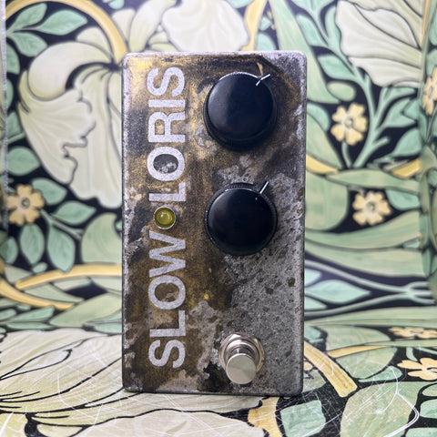 The Slow Loris is a dynamically driven lo-fi modulated slapback pedal. With a unique control set it will go anywhere from a subtle atmospheric vibrato/chorus to a delayed sea-sick warped vinyl lo-fi sound. With the control knob up it becomes more sensitive and instable, play lightly and you’ll experience a more subtle modulated slapback, but dig in and hit the pedal harder and you’ll trigger a deeper vibrato that will make your playing feel like it’s about to fall over.