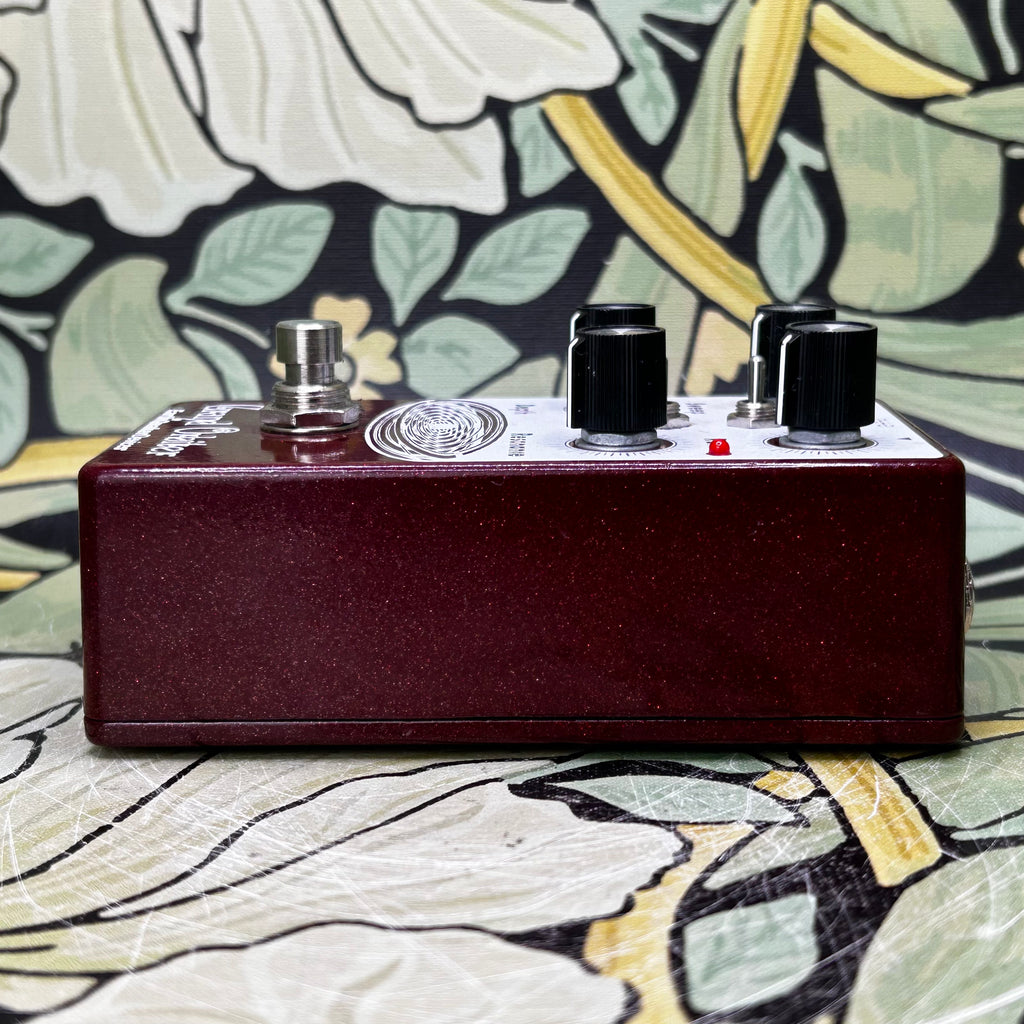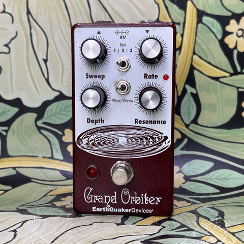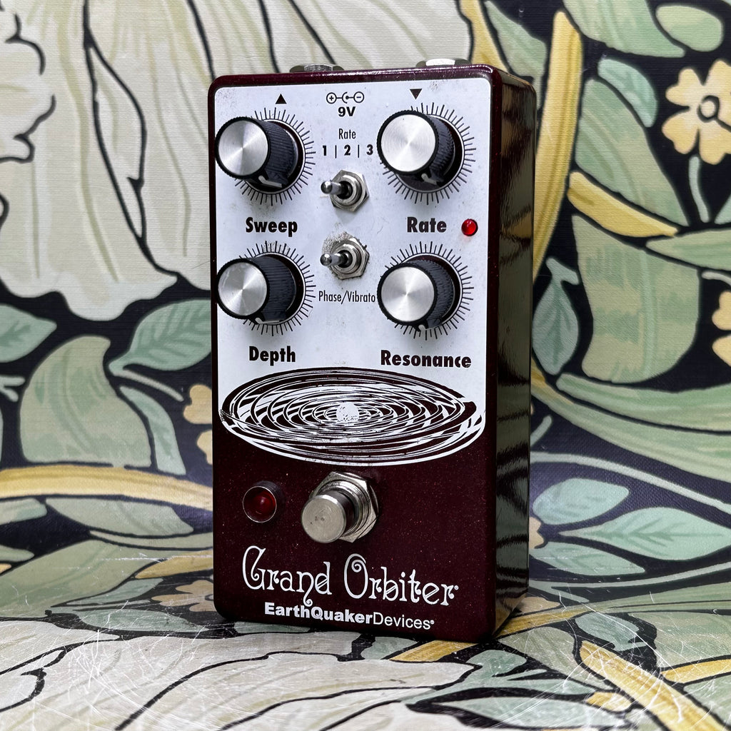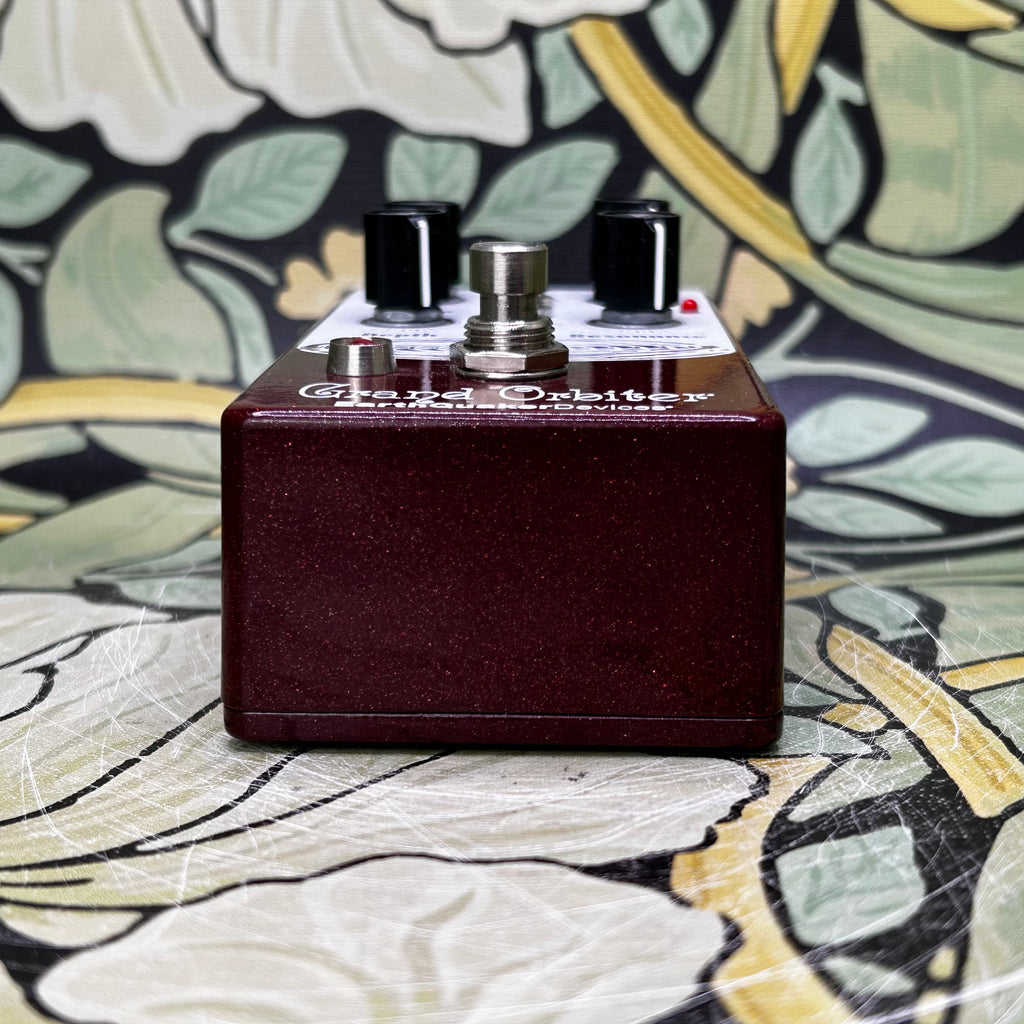 Grand Orbiter is a 4 stage OTA-based phaser with a diverse feature set that can go from stationary and resonant to slow and mellow and on through fast and swirly. It has three way toggle switch to select between the ranges of modulation. The master Rate control fine tunes the speed of the LFO in each of these modes and the flashing red LED acts as a visual indicator, even when the effect is in bypass mode. The Depth control blends the shifted signal in with the dry signal and controls the intensity of the effect. The Sweep control governs the peak frequency of the phased signal’s tone, turned full clockwise the sweep is lively and intense, whereas turning counter clockwise yields a darker, more laid back peak. The Resonance provides a wide range of control over regeneration and at higher settings adds a more pronounced and resonant tone. You can also use the Grand Orbiter as a true pitch vibrato with the “Phase/Vibrato” switch. When in “Vibrato” mode, the dry signal is removed and the Depth controls acts as a volume control. This pedal is 100% analog, true bypass and built entirely by hand in beachy Akron, Ohio.