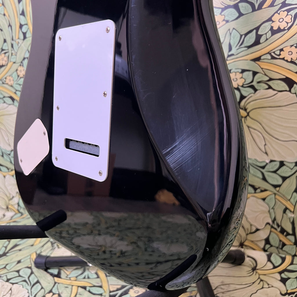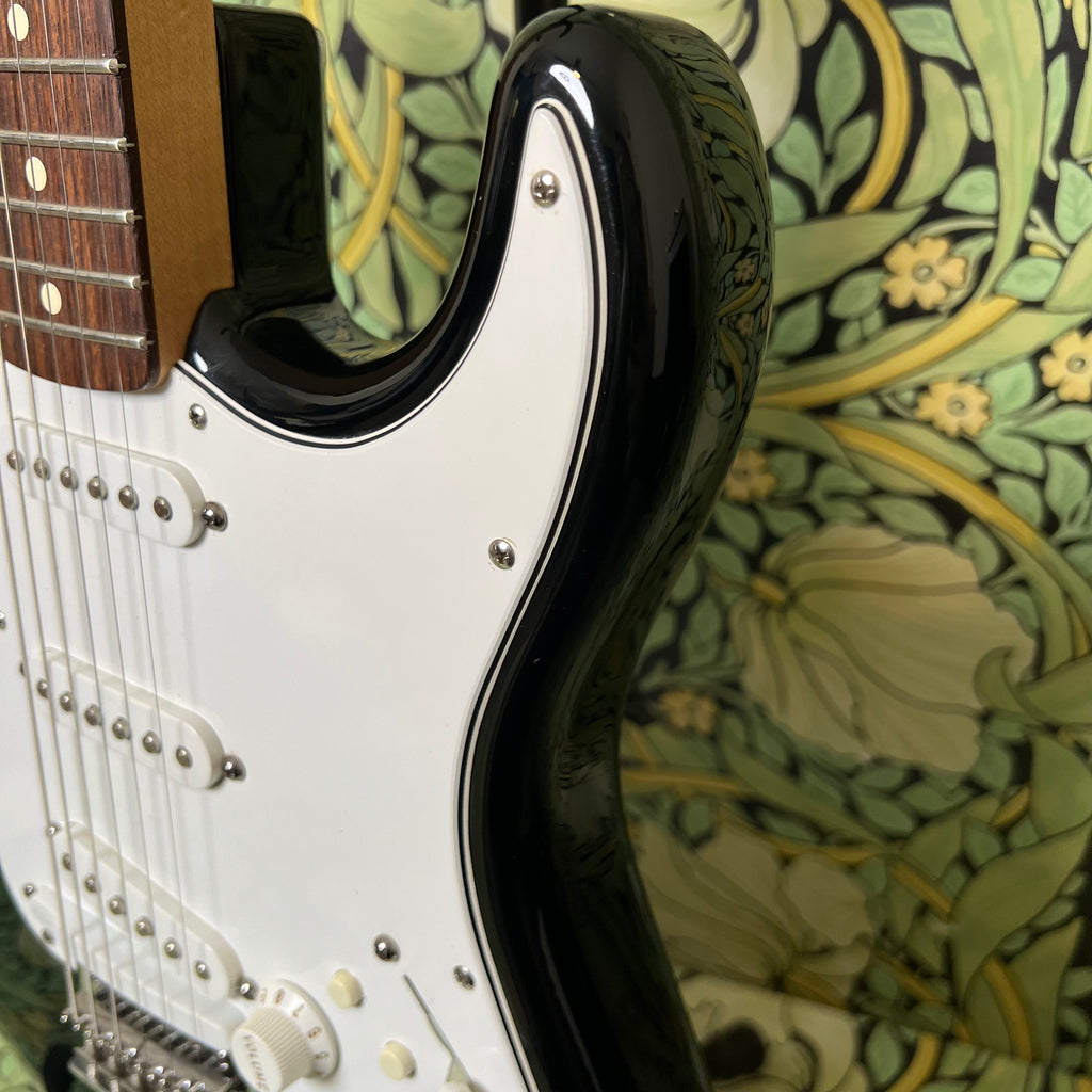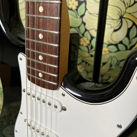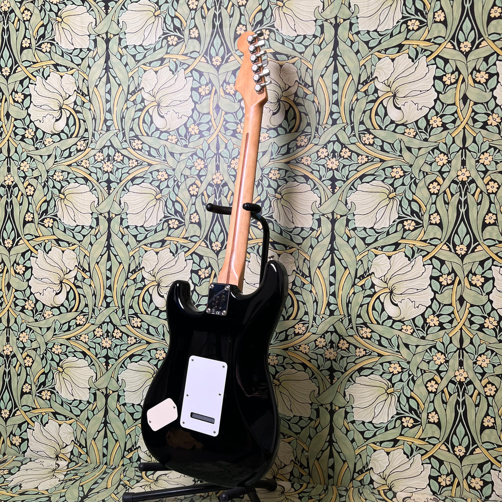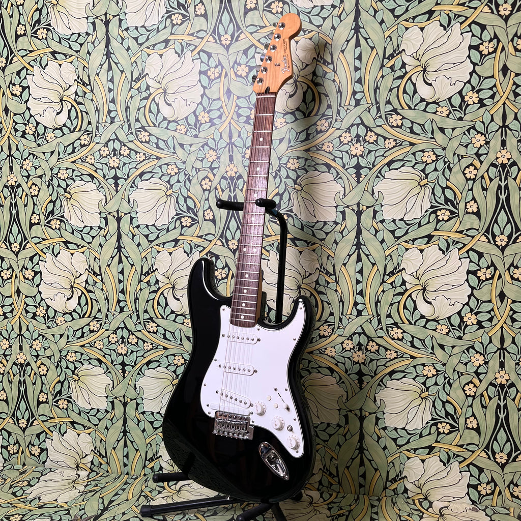 It has all the features of the Standard Stratocaster, like a modern C-profile maple neck (0.830"-0.860" thickness), rosewood 9.5" radius fretboard, 1.66" nut width, comfort-contoured body, three single-coil pickups (6.82k N, 6.87k M, 6.73k B), and synchronized tremolo, but it also adds the convenience of a built-in Roland GK-2A pickup system, which allows you to drive peripherals directly from the guitar's on-board controls.