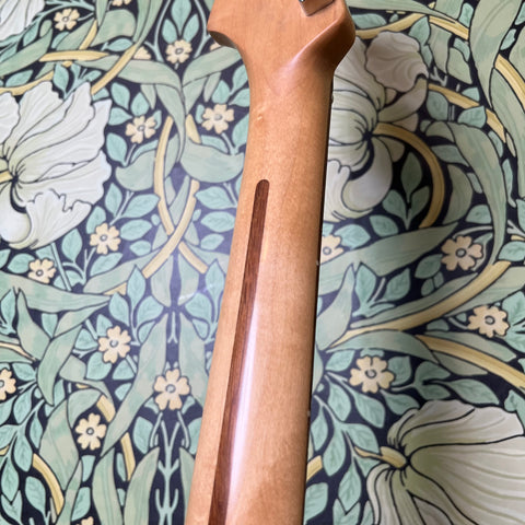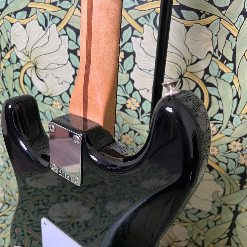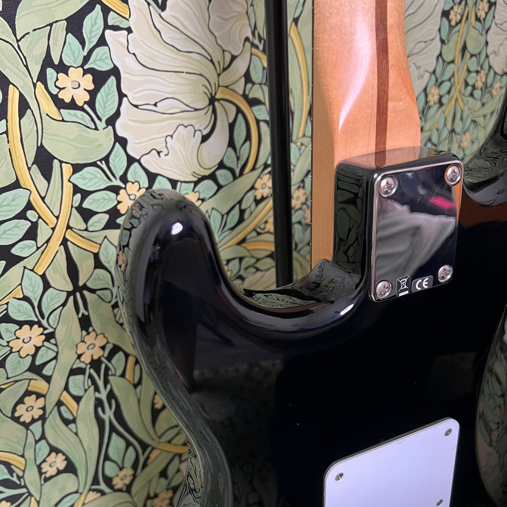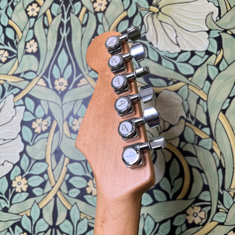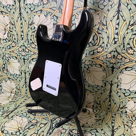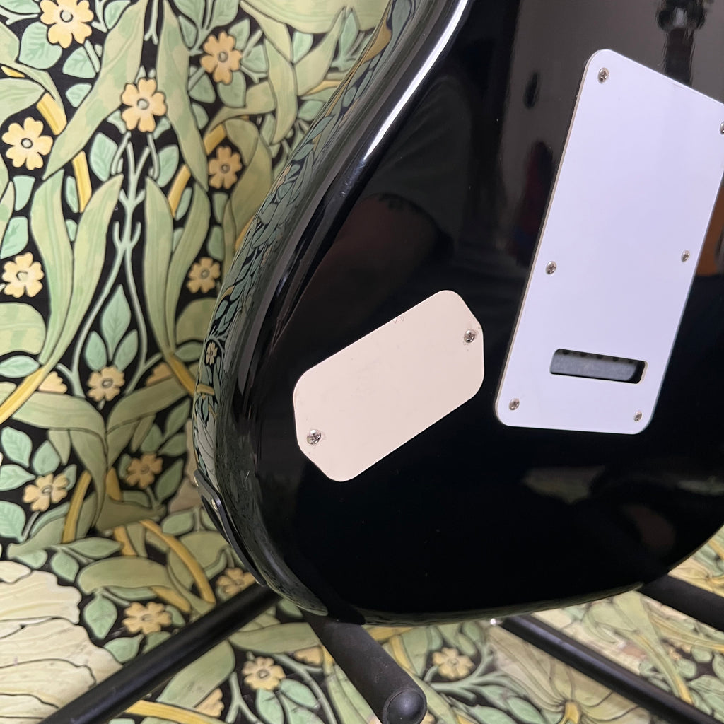 It has all the features of the Standard Stratocaster, like a modern C-profile maple neck (0.830"-0.860" thickness), rosewood 9.5" radius fretboard, 1.66" nut width, comfort-contoured body, three single-coil pickups (6.82k N, 6.87k M, 6.73k B), and synchronized tremolo, but it also adds the convenience of a built-in Roland GK-2A pickup system, which allows you to drive peripherals directly from the guitar's on-board controls.