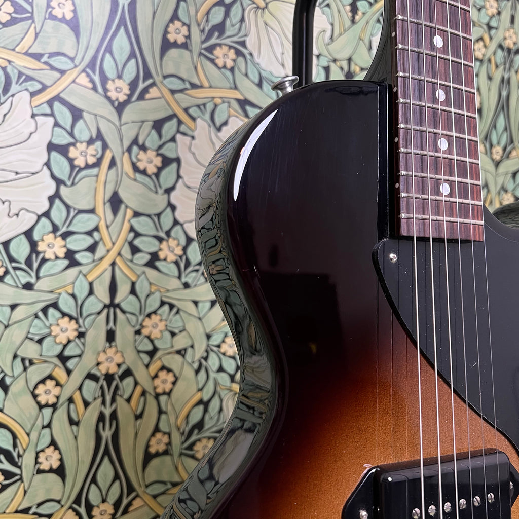The mahogany neck is a "C" profile measuring 0.880" and 0.995" at the 1st and 12th fret (respectively), it's certainly a comfortable fit, made for traversing the entire rosewood fretboard with ease. With a radius of 12" and a nut width of 1.685", this Junior feels like an old familiar friend.