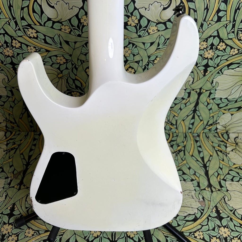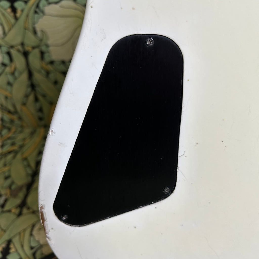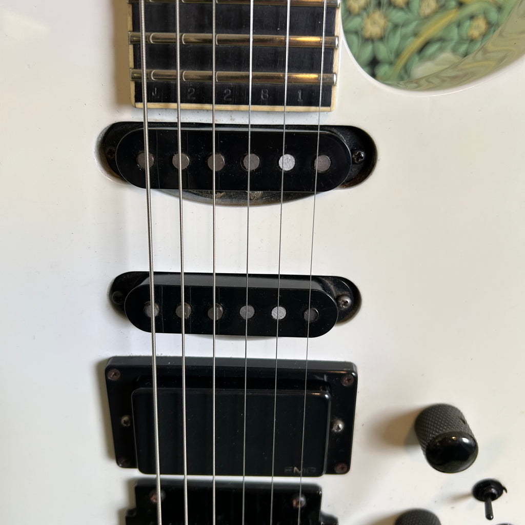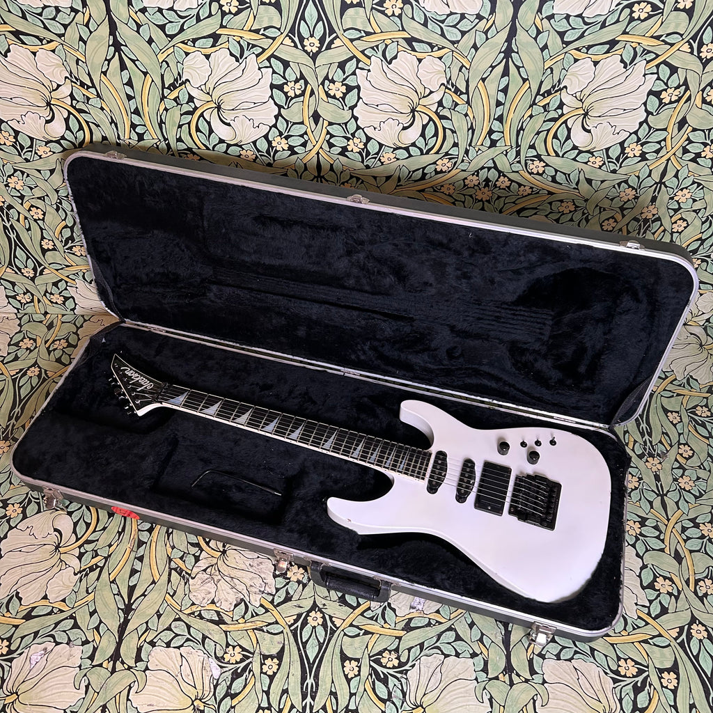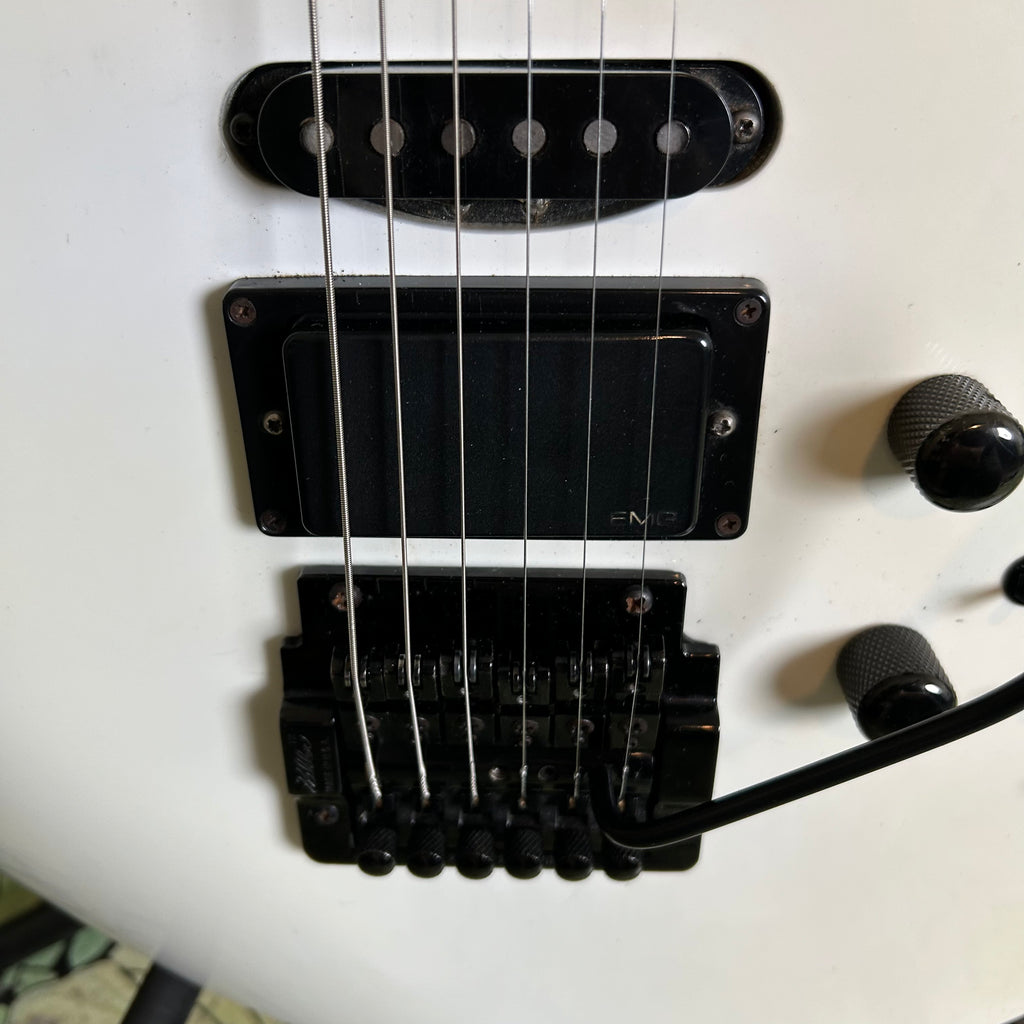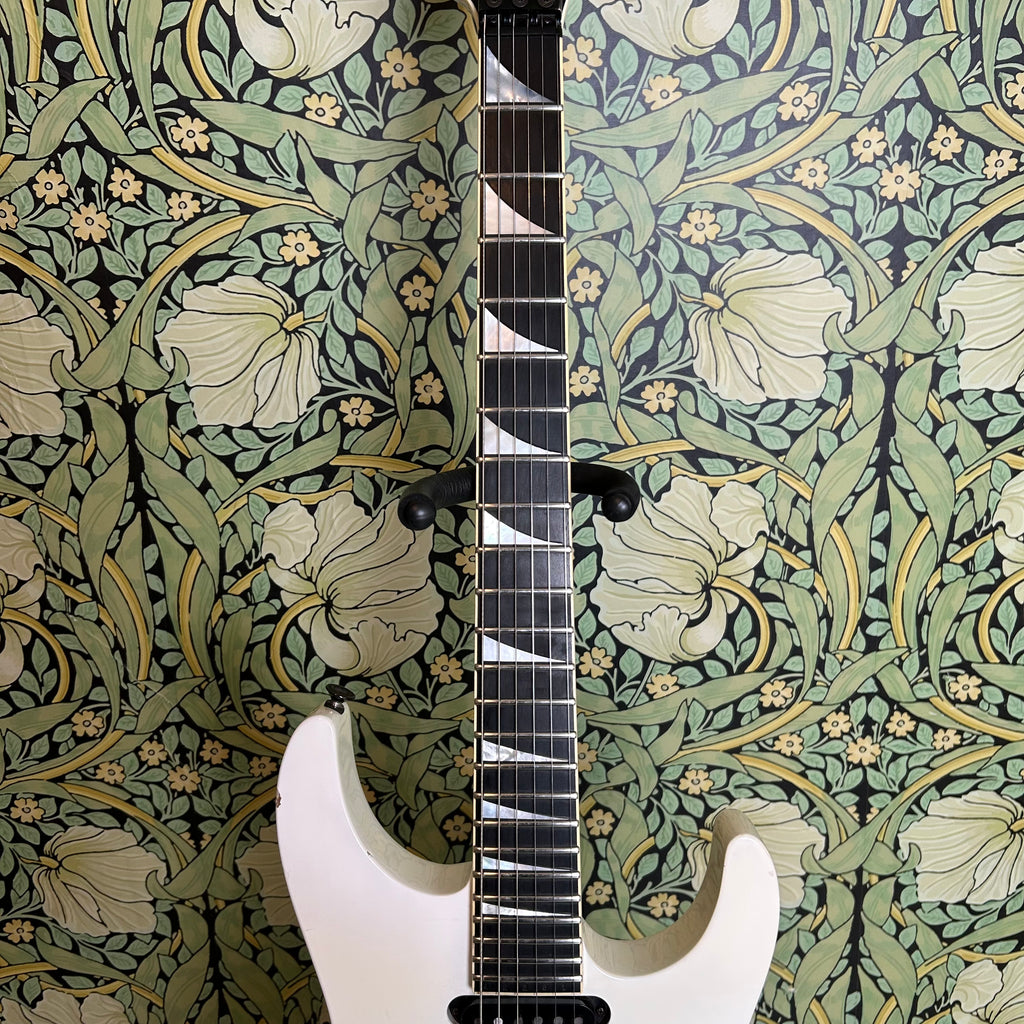 This badass guitar left the San Dimas factory in 1986, and it has some stories to tell. Classic maple body complemented by a matching maple slim C-profile neck with a thickness measuring 0.775" at the 1st fret and 0.875" at the 12th fret. It has a sweet ebony 16" radius fretboard featuring those iconic shark fin inlays, and a nut width of 1 11/16".