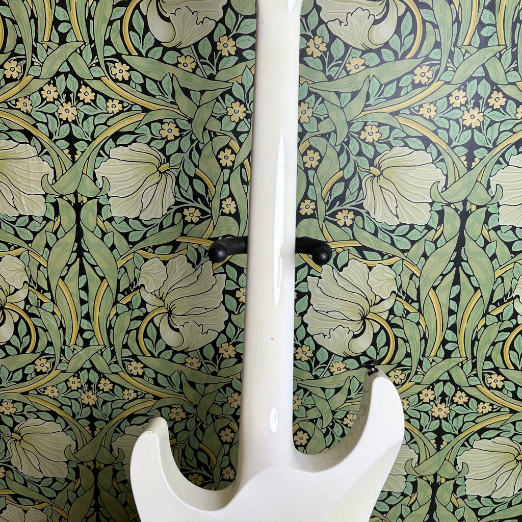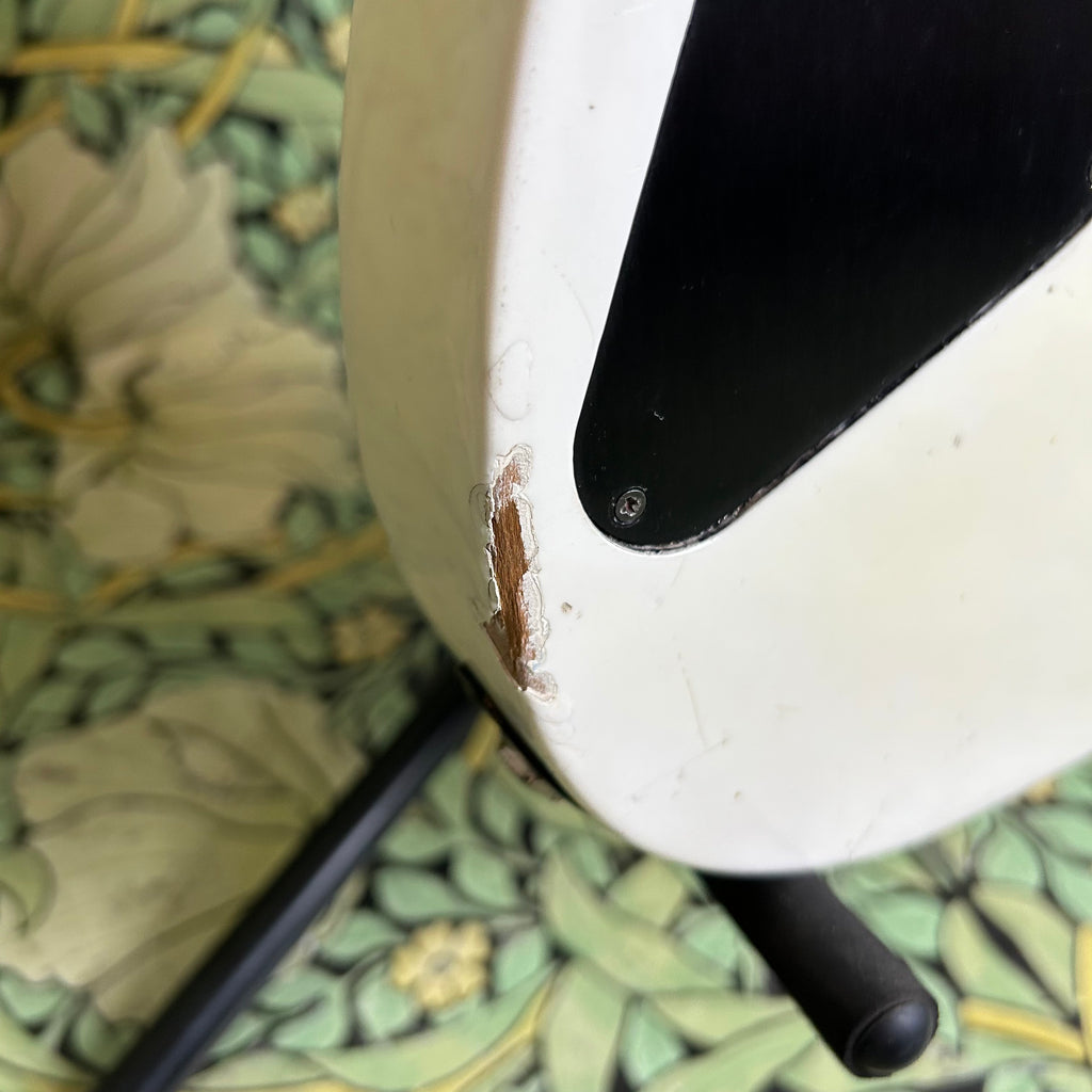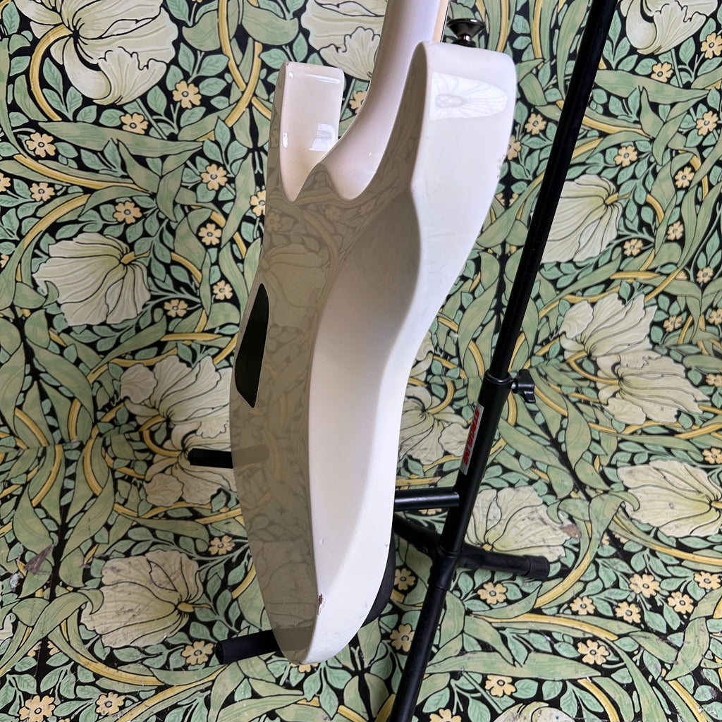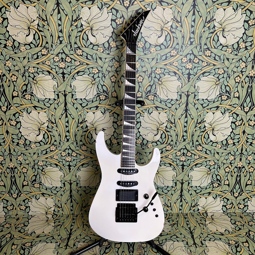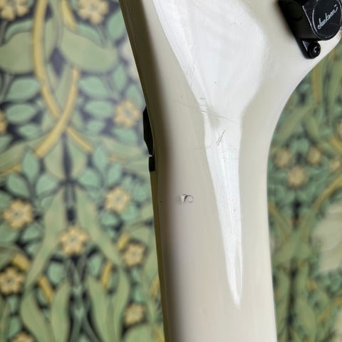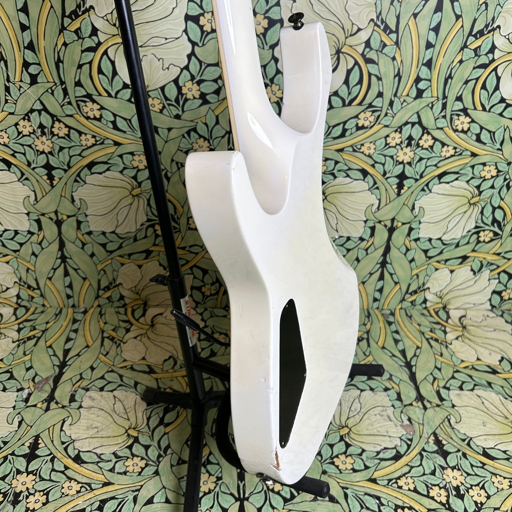 This badass guitar left the San Dimas factory in 1986, and it has some stories to tell. Classic maple body complemented by a matching maple slim C-profile neck with a thickness measuring 0.775" at the 1st fret and 0.875" at the 12th fret. It has a sweet ebony 16" radius fretboard featuring those iconic shark fin inlays, and a nut width of 1 11/16".