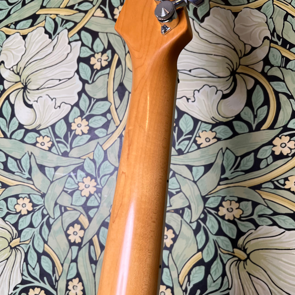 There are some beautiful appointments on this red korina baby. Let's start with that gorgeous maple neck! It's got a comfortable C profile, with thickness measuring 0.825" at the 1st fret and 0.925" at the 12th, and a nut width of 1.650".