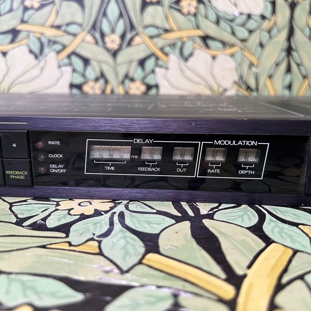- The front panel includes knobs and buttons for controlling delay time, feedback, modulation (rate and depth), delay phase, feedback phase, and a filter.