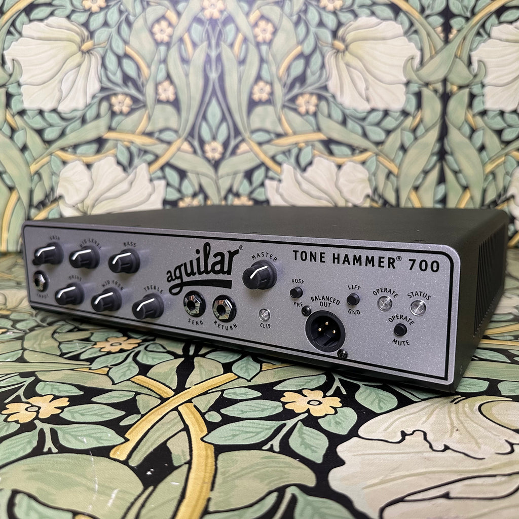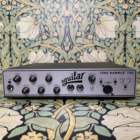 The 4.9 lb. (2.22 kg) Tone Hammer 700 delivers 700 continuous watts @ 4 or 2.67 ohms, 350 watts @ 8 ohms and features bass, treble and fully sweepable midrange controls. The Drive control utilizes Aguilar’s proprietary AGS circuit which adds subtle distortion and midrange punch to the sound.