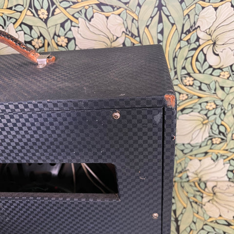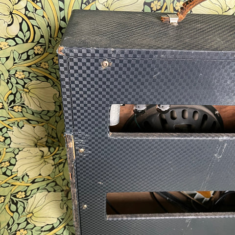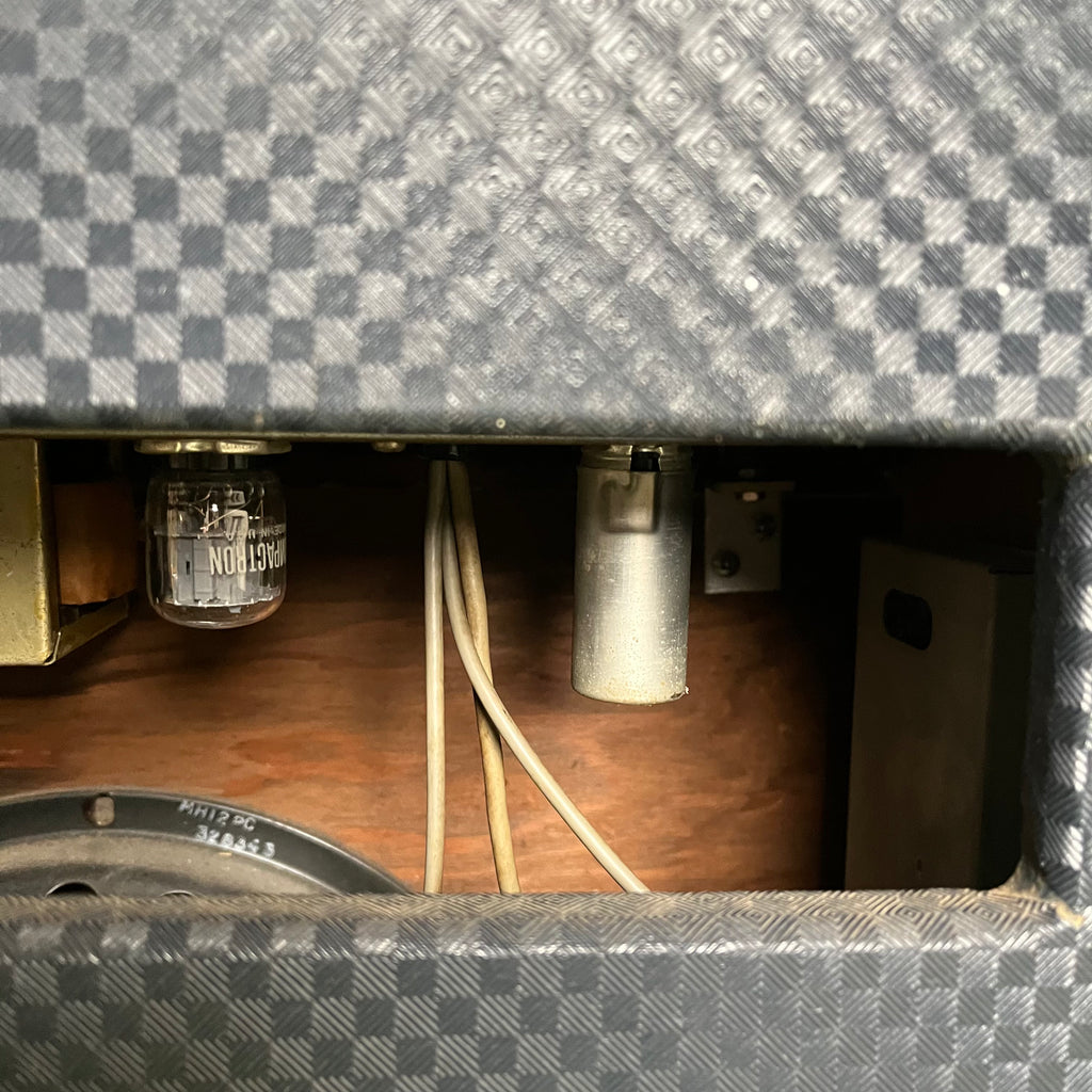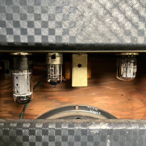 It's been fully fortified with reinforced chassis mounts, a common and welcomed mod for this series. Home to a period-correct Utah 12" speaker and a pair of Sylvania 7591 tubes, you can rest assured this thing SINGS. Surfy, bold, and bright, shimmering tube warmth.