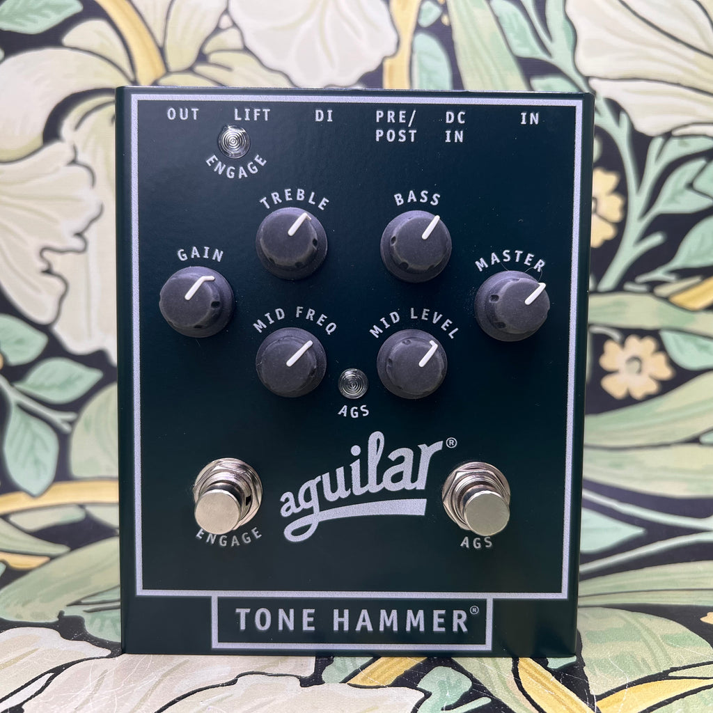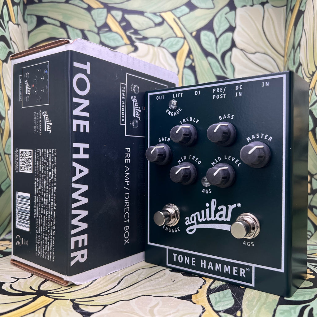 Based on the coveted Tone Hammer amplifier, the Tone Hammer preamp/DI is Aguilar's swiss-army knife bass pedal. Featuring a fully sweepable midrange frequency knob in addition to bass and treble controls the Tone Hammer gives you studio-inspired EQ paired with a pristine D.I. for studio and stage use alike. To give this tone shaping unit the ultimate flexibility, Aguilar introduced their proprietary Adaptive Gain Shaping circuitry (AGS). AGS allows the player to kick in an additional gain structure allowing you to go from modern to vintage tones. Tube-like saturation with the stomp of a button. It’s 18 volt operation gives the Tone Hammer plenty of headroom to reproduce the most dynamic playing styles and it robust design makes this pedal truly road-worthy.