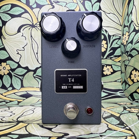 The T4 is Browne's take on the classic 4 transistor fuzz, similar to the circuits used in the big muff and countless other variants. What sets the T4 apart is a flattened EQ curve that brings the mids back in and helps cut through the mix.