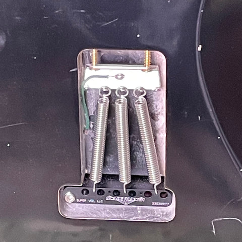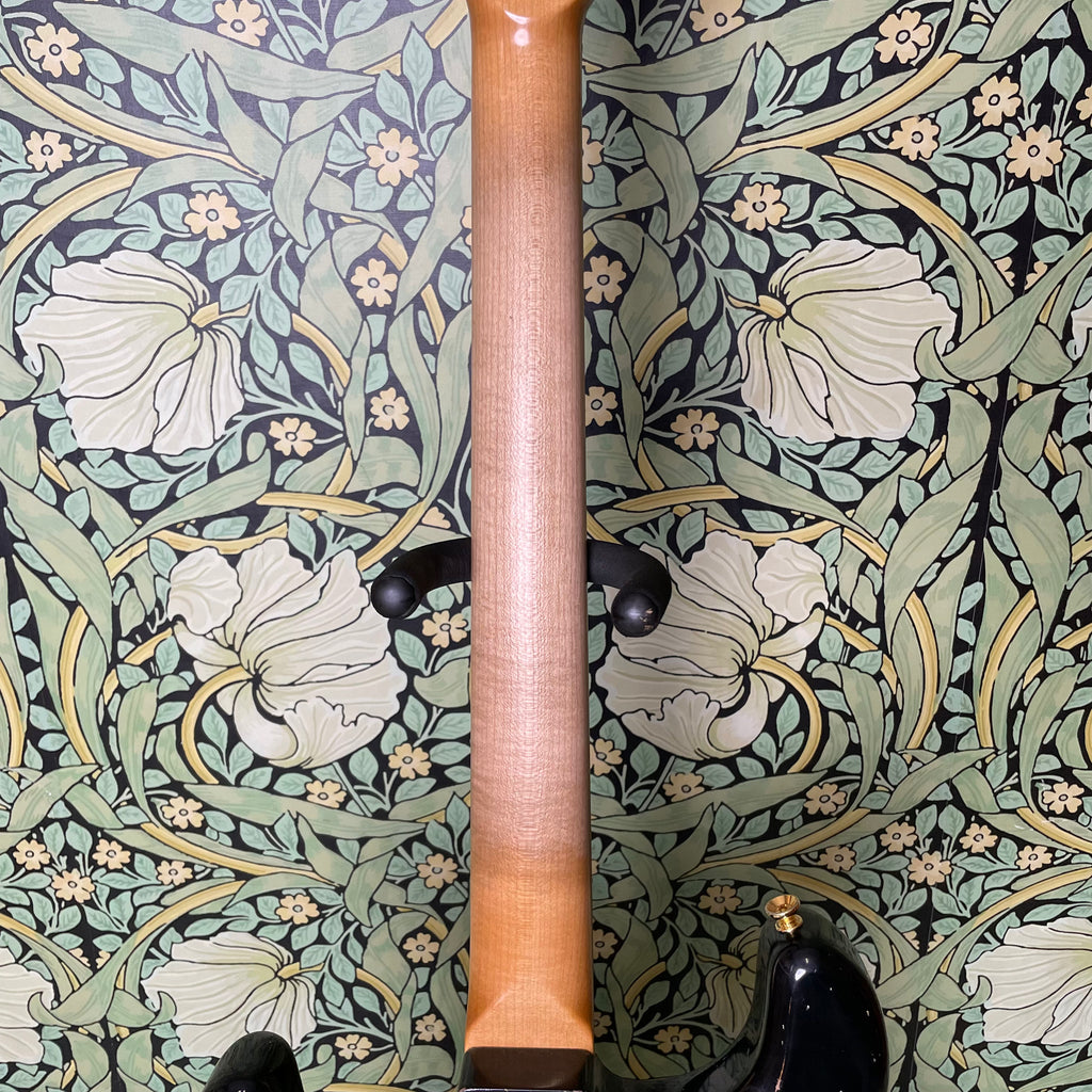 In proper S-style, this build features three single coil pickups--Rocketfire Total 60s and a Super Splitter, to be exact, configured with your standard 5-way toggle wiring. The body is made of Roasted Swamp Ash and the neck is Quartersawn Maple with a Brazillian Rosewood fretboard. The C neck features a radius of 9.5", a thickness of 0.854" and 0.984 (1st and 12th), and a 1.65" nut. Yeah, it's pretty "bat" like! The fretboard is decked out with aged clay dots and tall frets. And yes, that sleek black finish is nitro! Altogether weighing in just under 7.5 pounds.