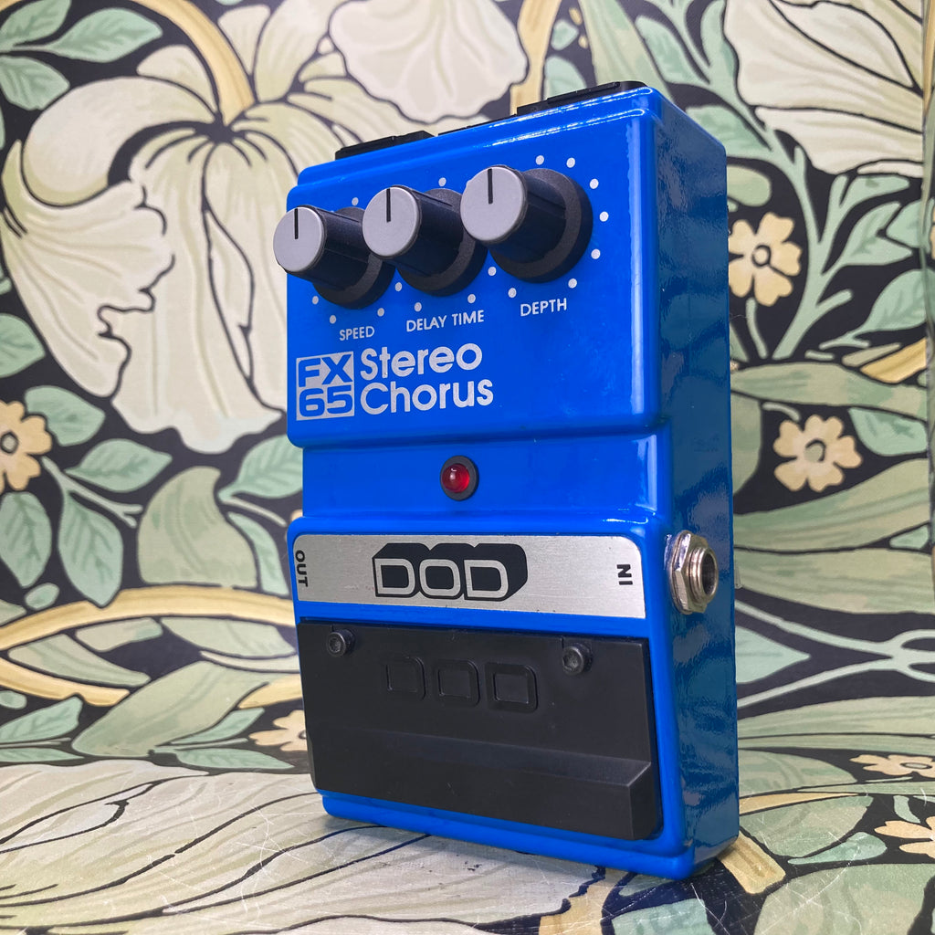The DOD Stereo Chorus FX65's first series was initially produced in 1985 as an improvement upon DOD's beginner FX60 Stereo Chorus. Its analog chorus, using an MN3007 BBD chip, is controlled using Speed, Delay Time, and Depth knobs to thicken up your tone. Two output jacks give you great, subtle stereo chorus sound.