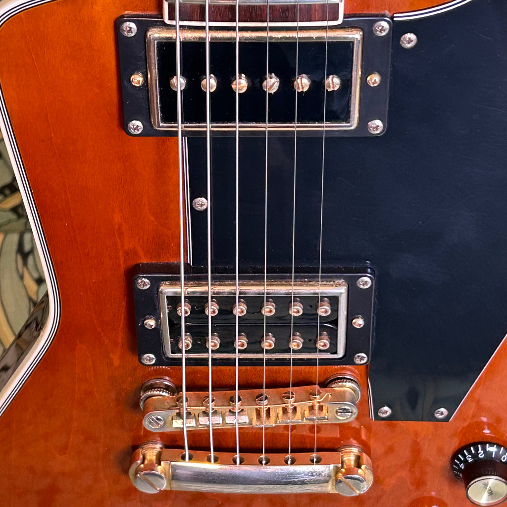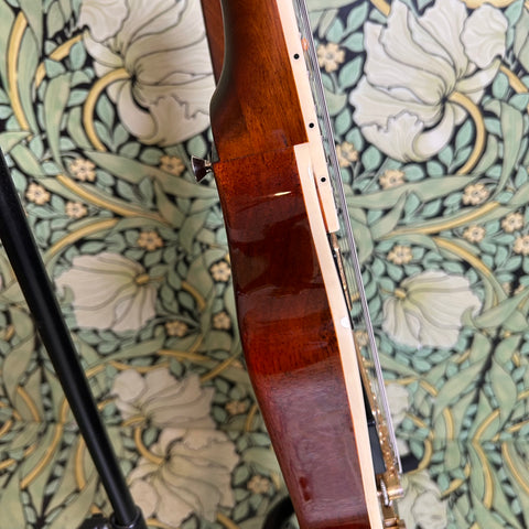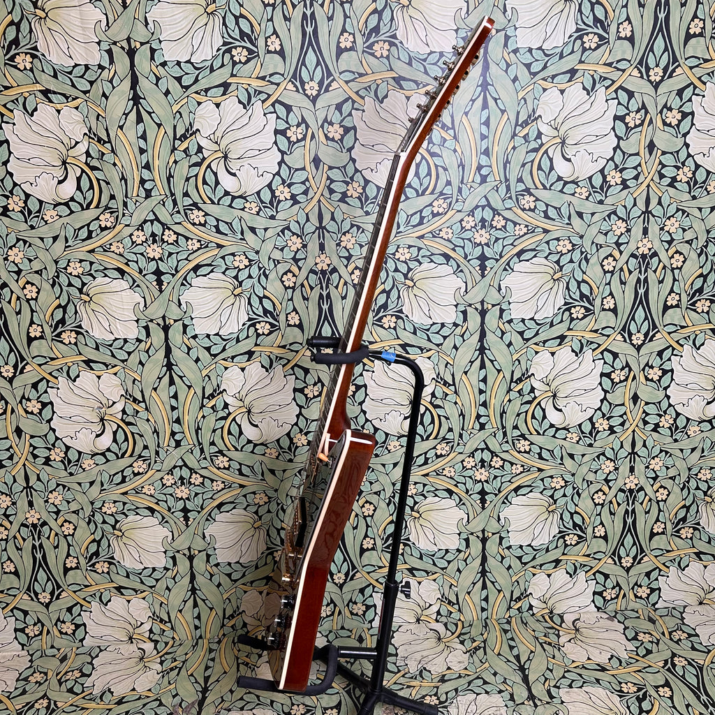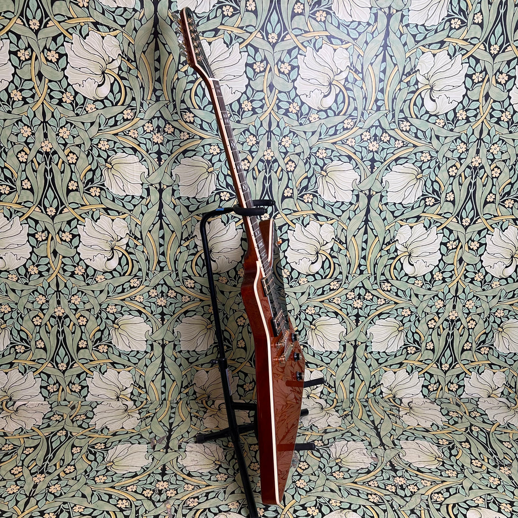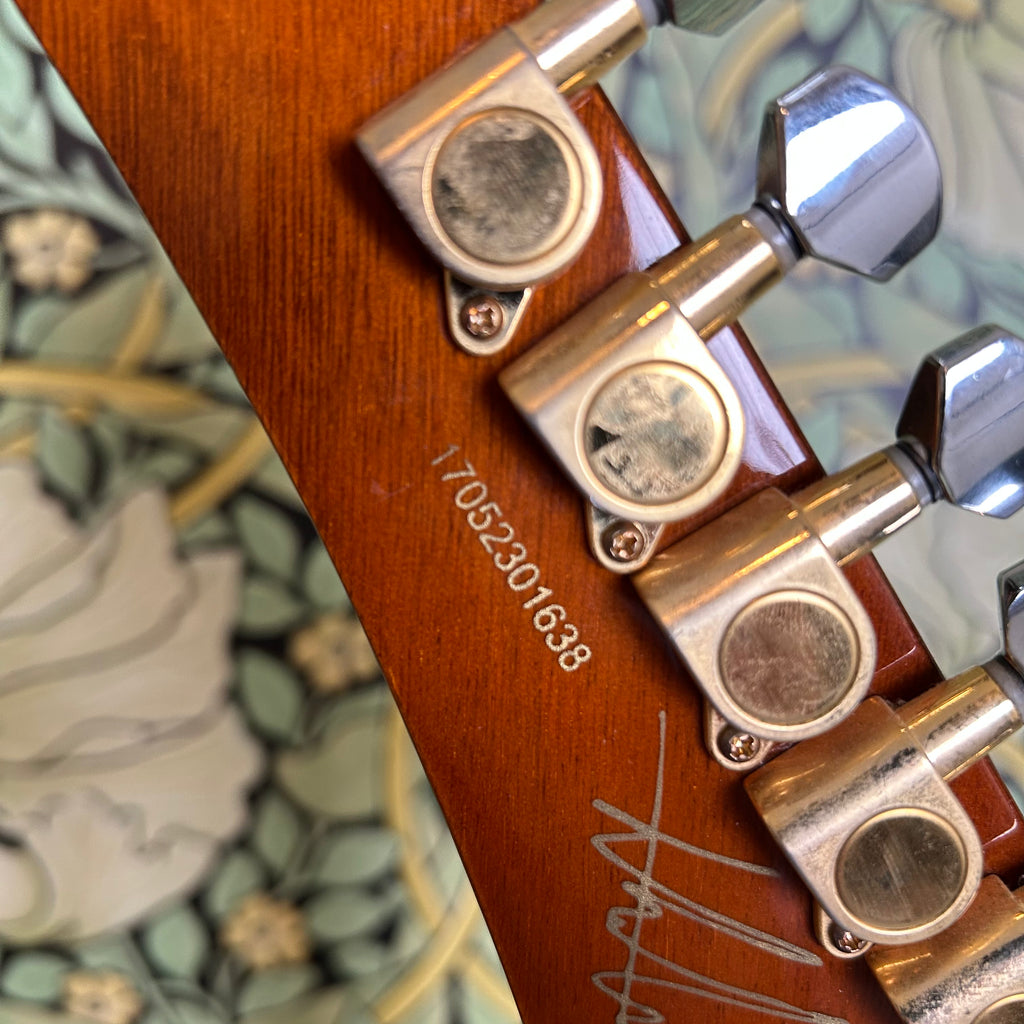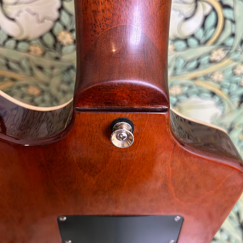 This Artisan ax is crafted with toneful maple top and mahogany back and sports a beefy '59 C-shape taper mahogany neck (.850"-.965") with a 12" radius rosewood fingerboard, nut measuring at 1.680" and altogether weighing in at 8.36lbs.