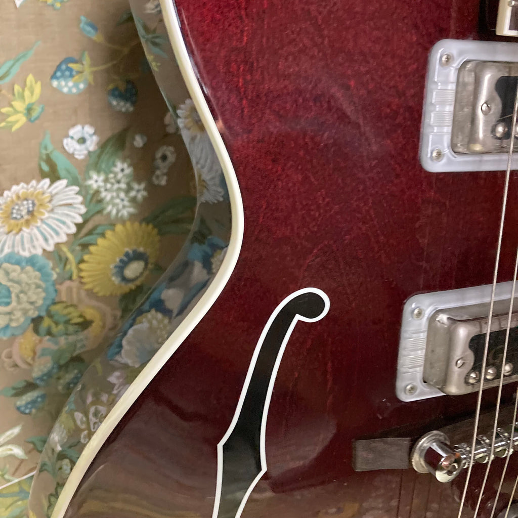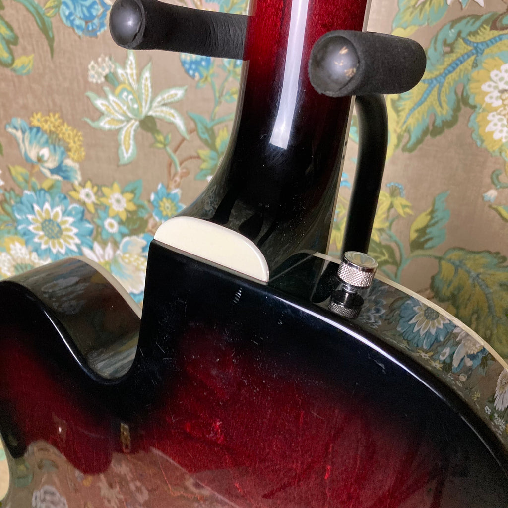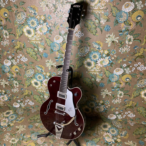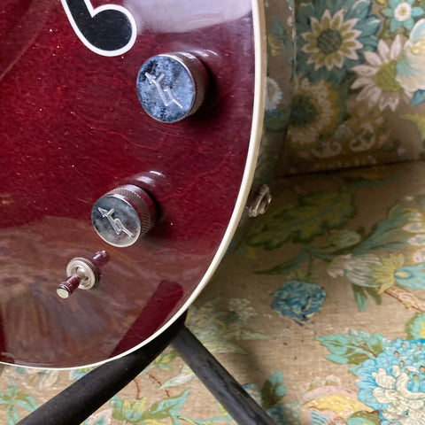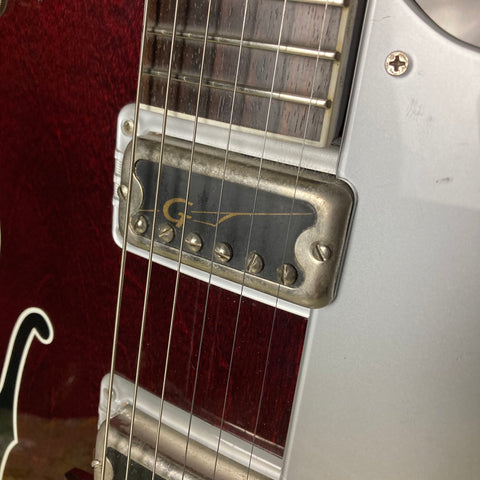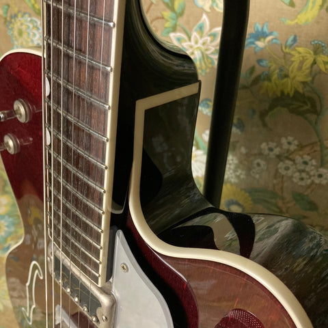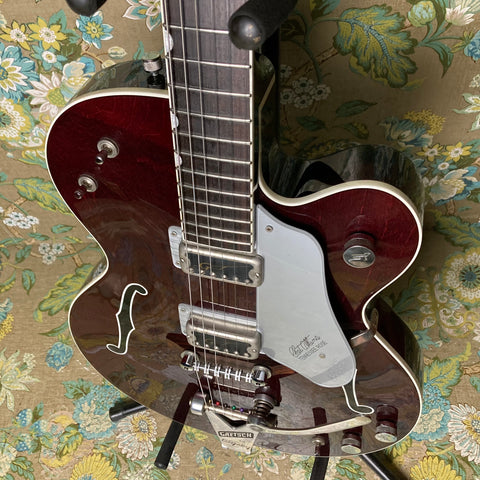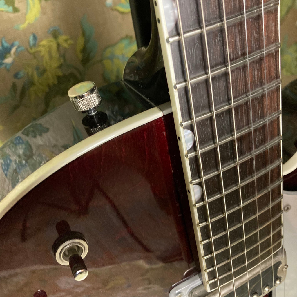 This honky tonkin' deep cherry stained hollowbody features a smooth C-profile maple neck measuring 0.811" at the 1st fret and 0.937" at the 12th, a 12" radius rosewood fretboard with zero fret, and a nut width of 1.708". It comes loaded with a set of twin Filtertron pickups, and a plethora of tone options with all those controls.