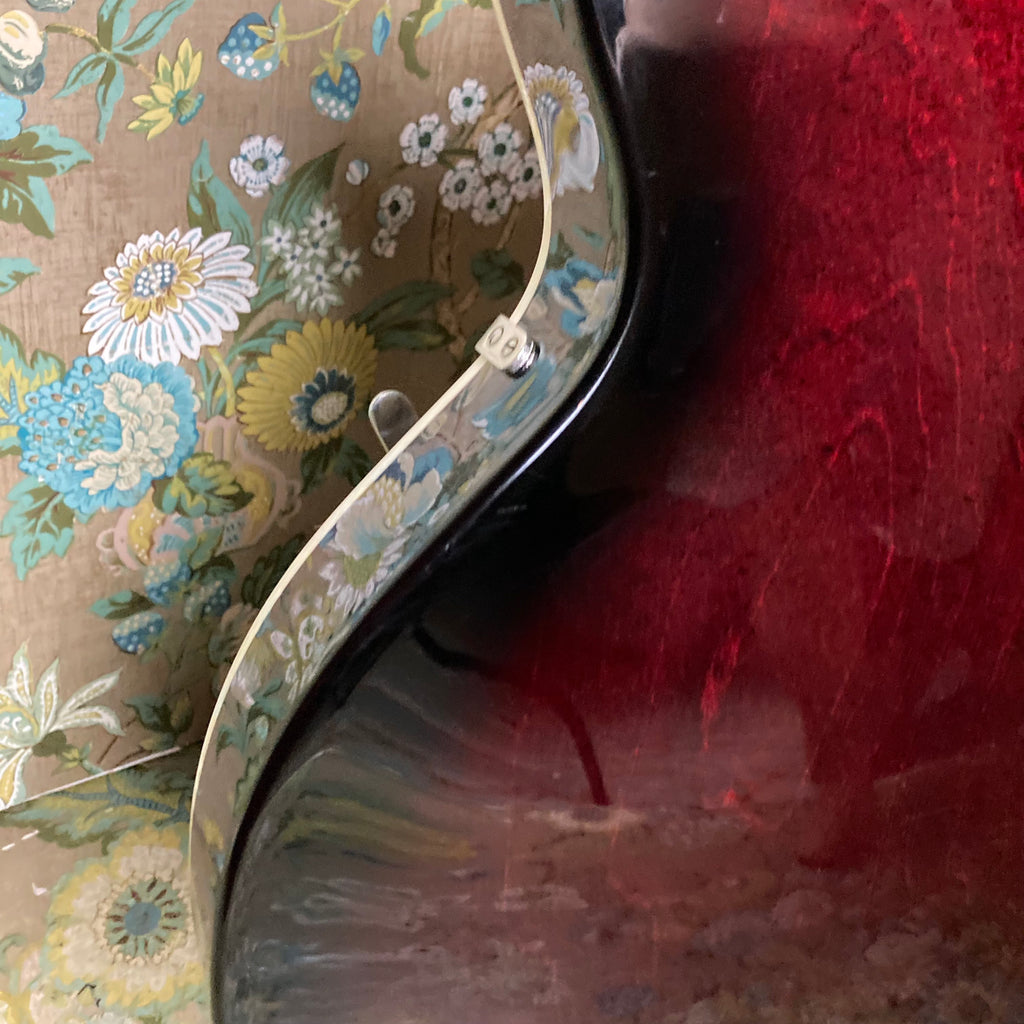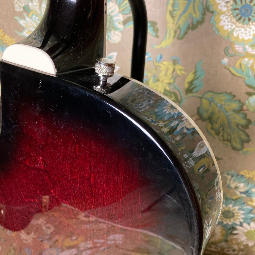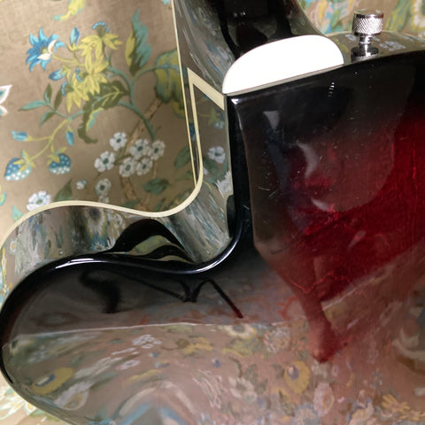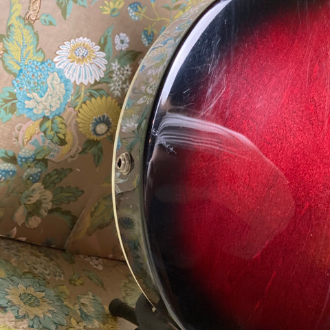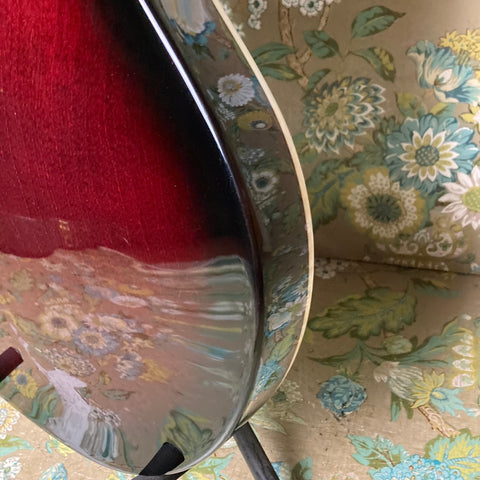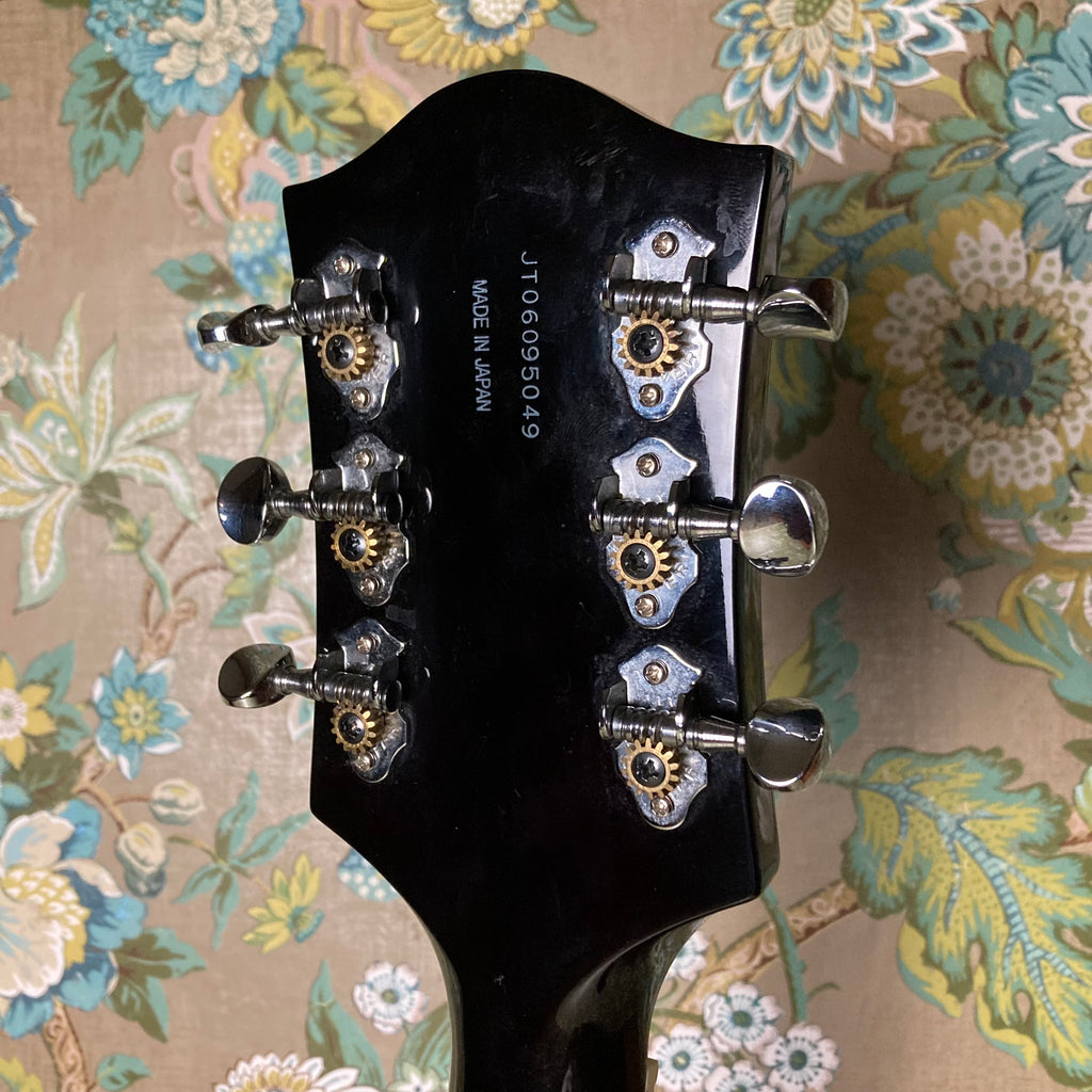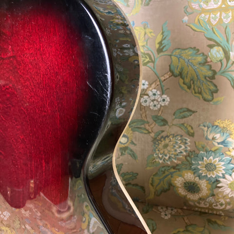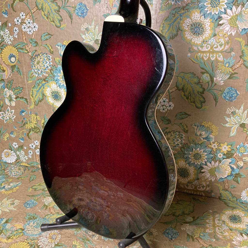 This honky tonkin' deep cherry stained hollowbody features a smooth C-profile maple neck measuring 0.811" at the 1st fret and 0.937" at the 12th, a 12" radius rosewood fretboard with zero fret, and a nut width of 1.708". It comes loaded with a set of twin Filtertron pickups, and a plethora of tone options with all those controls.