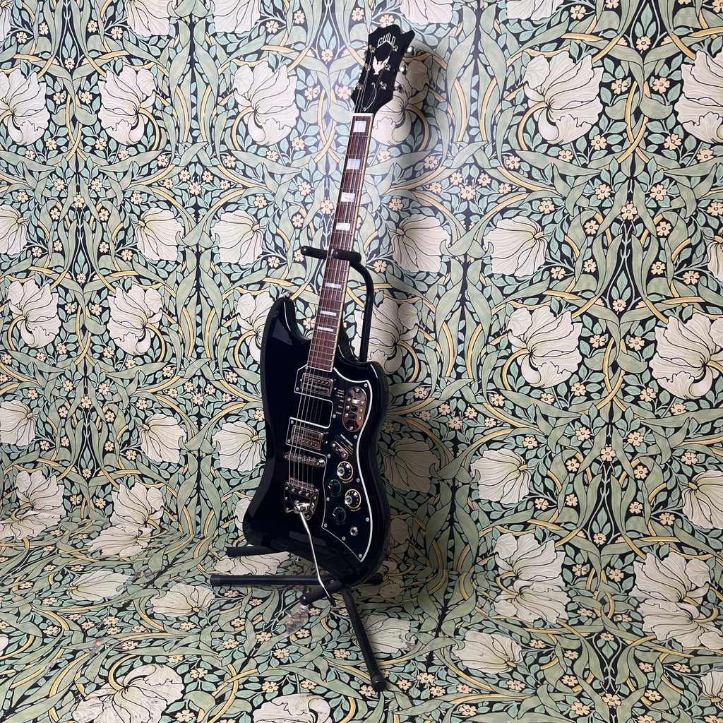 You gotta hand it to Guild, in a sea of Fender and Gibson body style clones–this is something properly unique. You're not just looking at an offset that started melting in a hot car folks. This is a in fact a kick-ass, elegantly designed instrument with a flowing body style choc-full of switches, knobs, buttons, and thank the lord, LABELS!! Who knew a fella could be so stoked about some words? By the time you're done reading this listing, you'll be sure to have that mouse hovering over the add to cart button.
