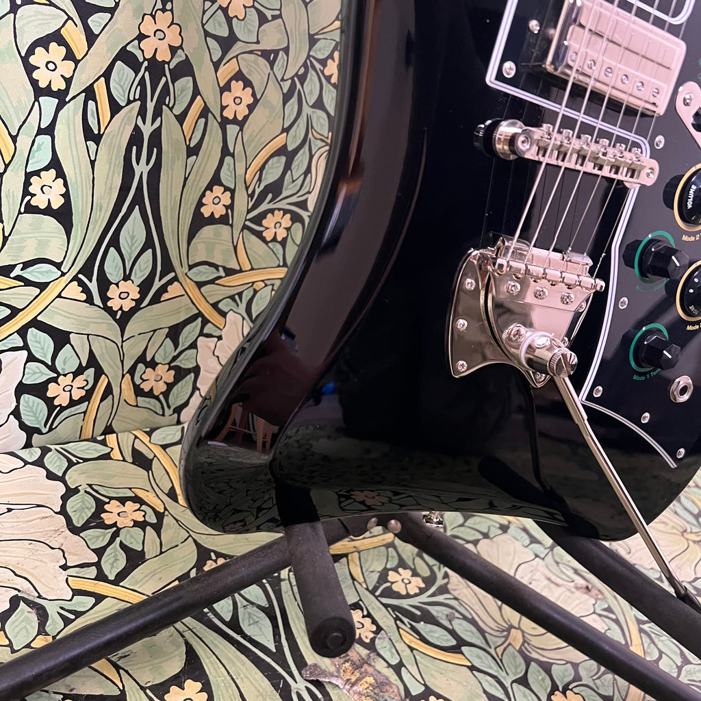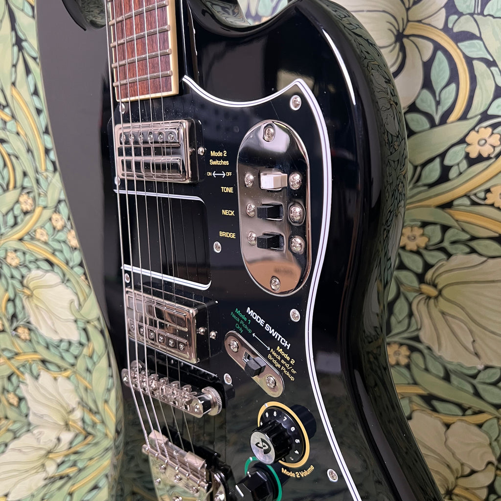 "The switching system—particularly the 3-switch array—conjures the look and, to some extent, the function of the Jaguar’s. You activate the 3-switch set by setting the slider switch by the bridge pickup to the down position. This enables you to use the bridge and neck pickups individually or together and switch in the bass-cut tone capacitor for any combination. Switching the two-position switch to the “up” setting gives you the neck pickup exclusively, which enables you to shape different neck-pickup tone profiles using the independent volume and control sets, and switch between them using the mode switch. You can’t perform the same dark-to-light tone shifts within the range of the bridge pickup, although the tone capacitor switch is useful for creating a thinner, more high-mid-focused and single-coil-like tone that sounds cool for funky vamps and with thin fuzz tones."