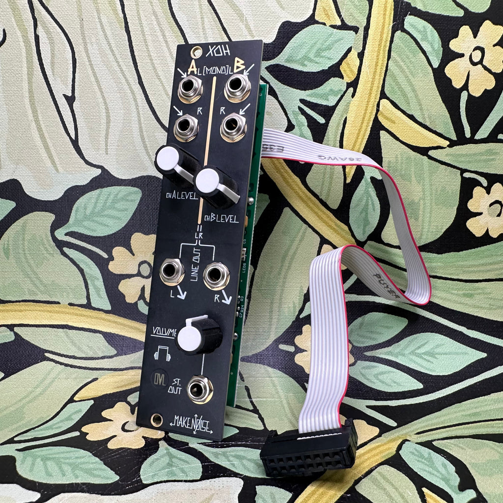 The XOH (miX Out Headphone) music synthesizer module is a stereo mixer, headphone amplifier and output interfacing module for your modular synthesizer. It consists of two stereo input channels with independent level controls, and two stereo outputs: one pair of independent line level left and right outputs at unity gain; and one TRS headphone or line level output with dedicated level control.