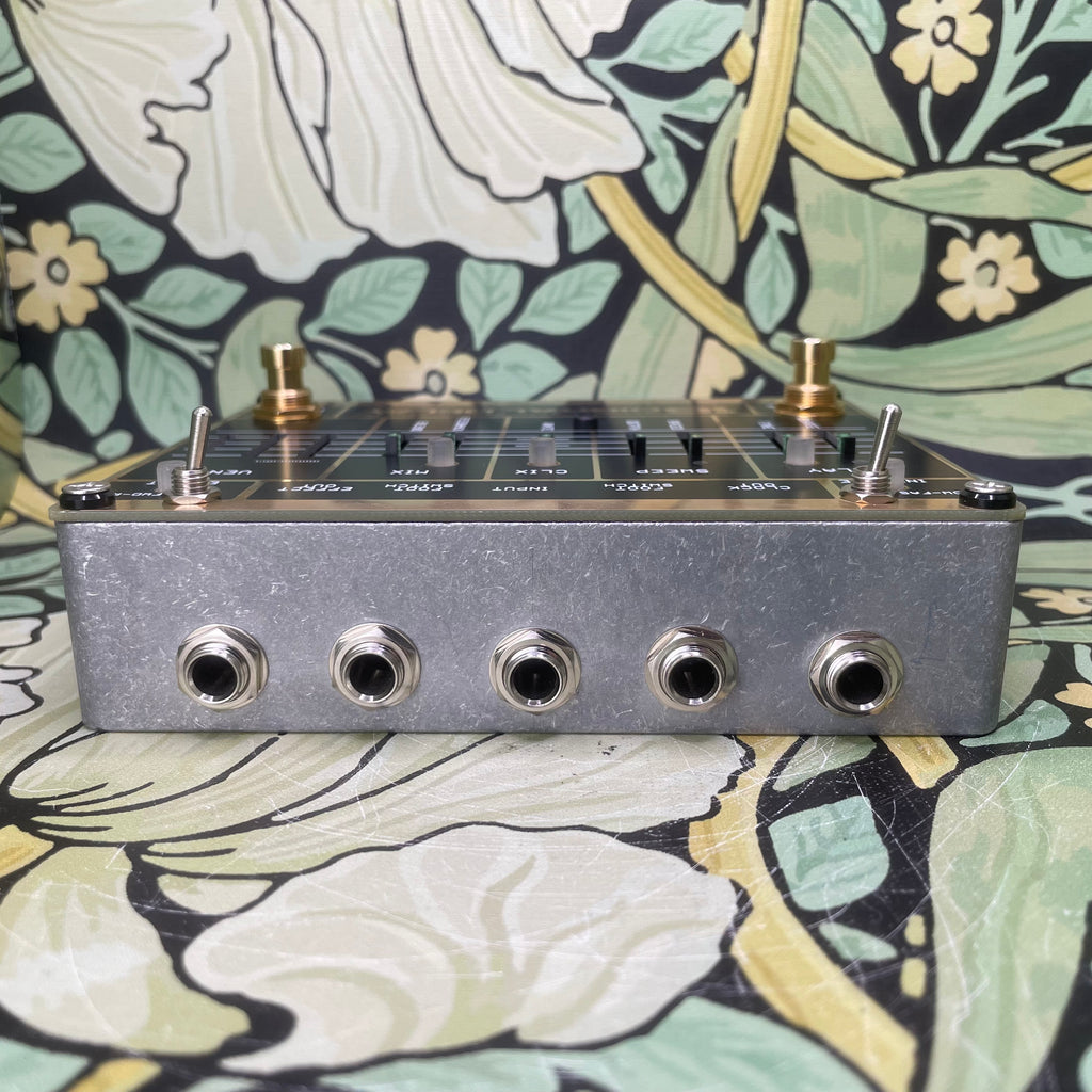 On board footswitches control infinite/freeze from the delay buffer , and bypass for the whole unit. Slider illuminated controls are delay time coarse, delay time fine , sweep rate and depth , clix volume , feedback and mix.