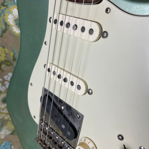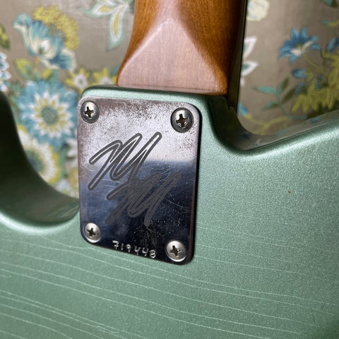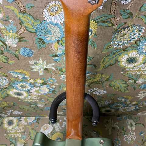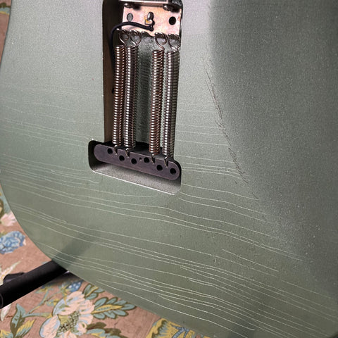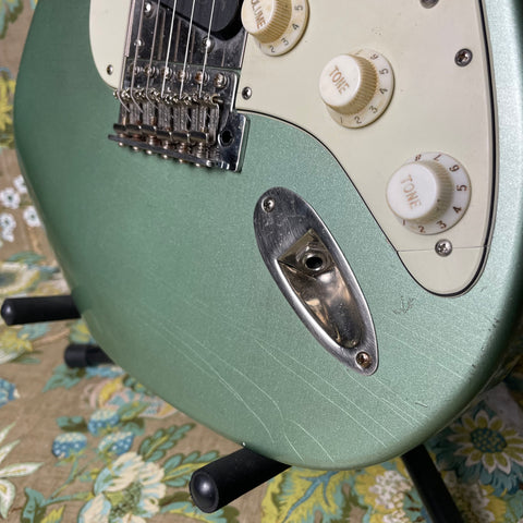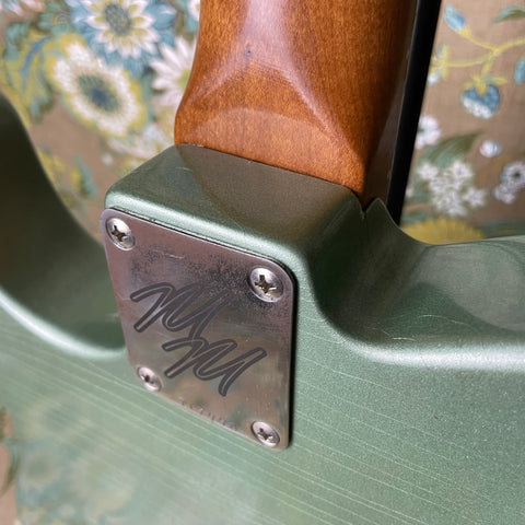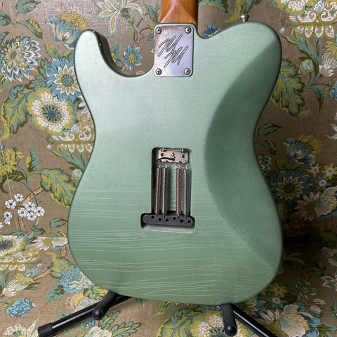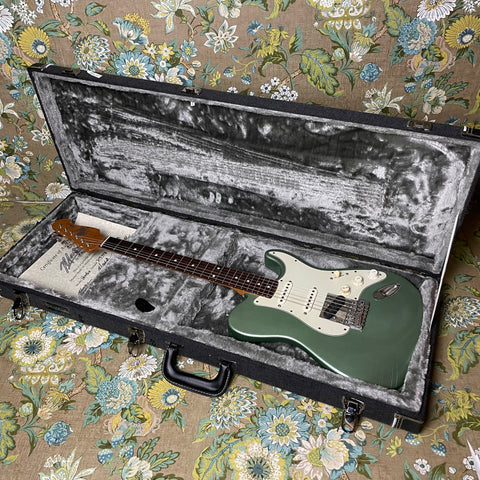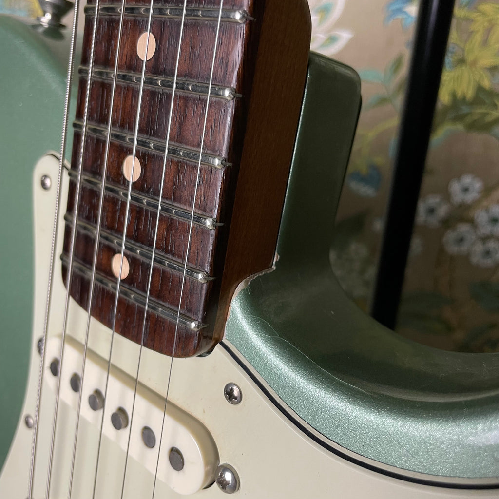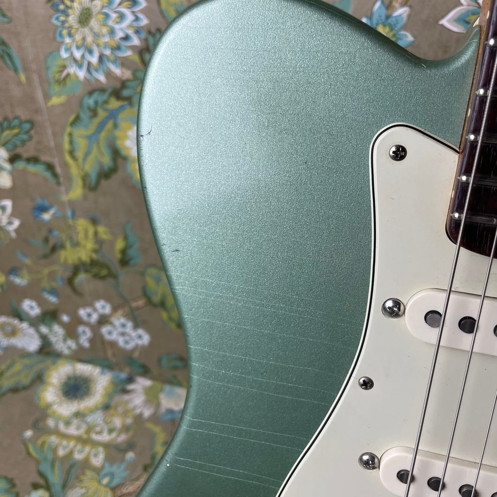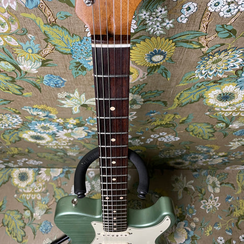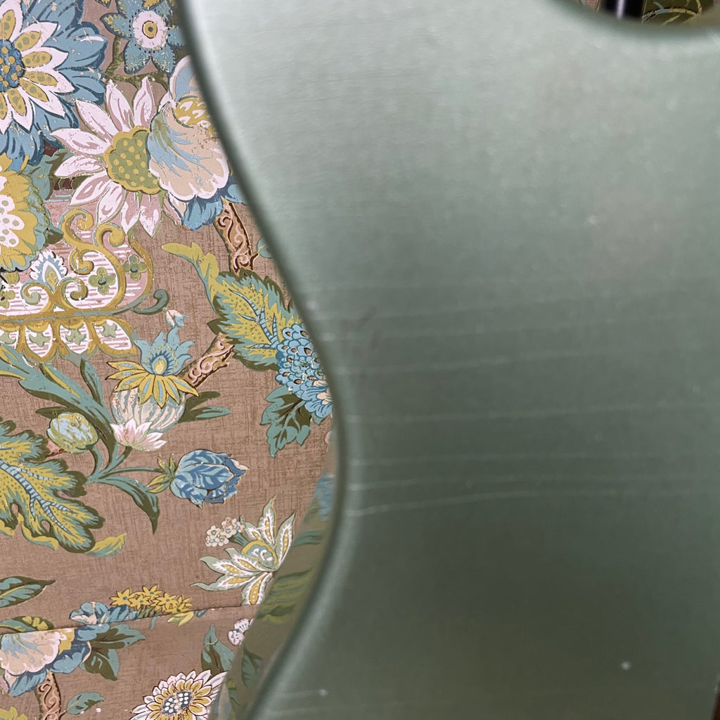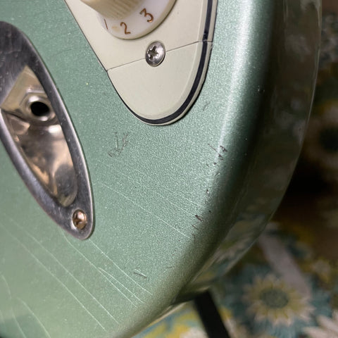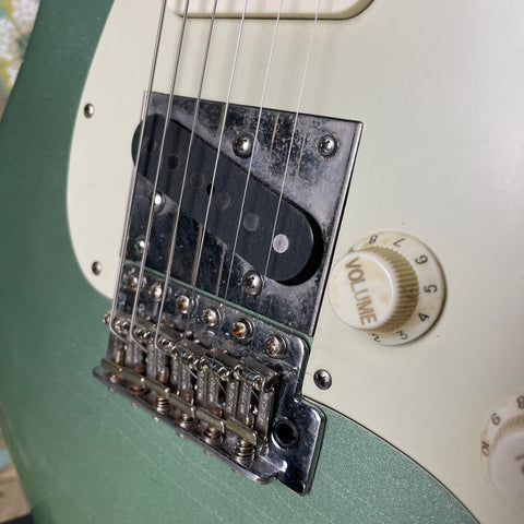 Crafted from a swamp ash body this lightweight champ is loaded up with a set of Porter single coils that give ya the classic Strat tone with some extra ball (N: 6.06k, M:6.36k, B: 6.81k). Now let's talk about this finish, the relic work is SOLID and this avocado mist color is stunning. Really can't be appreciated truly without seeing it in person. DANG DUDE, somebody get this!