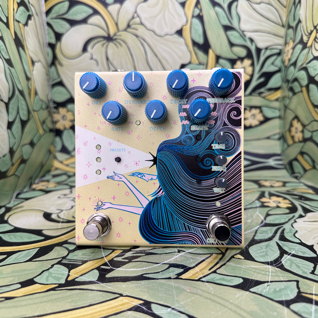 Sunlight is a reverb pedal focused on motion and dynamics. Post-reverb delay, filtering, and volume control all can be modulated via the onboard LFO, letting you craft your own flanger, chorus, moving filter, or tremolo effects through different combinations of parameters. A dynamic knob lets you either create dynamically held trails or enveloping LFO rates. This counterpoint to Dark Star brings lightness and excitement, and sits perfectly on a pedalboard alongside it.