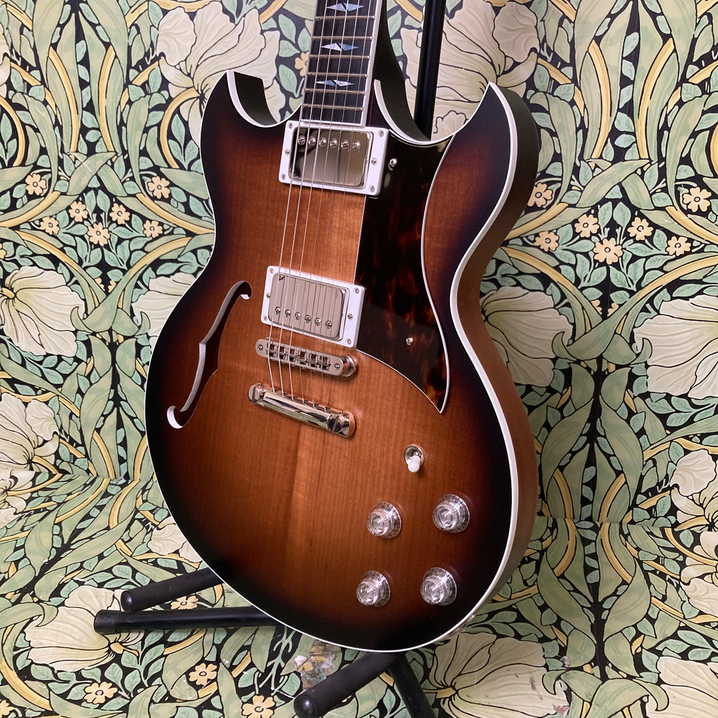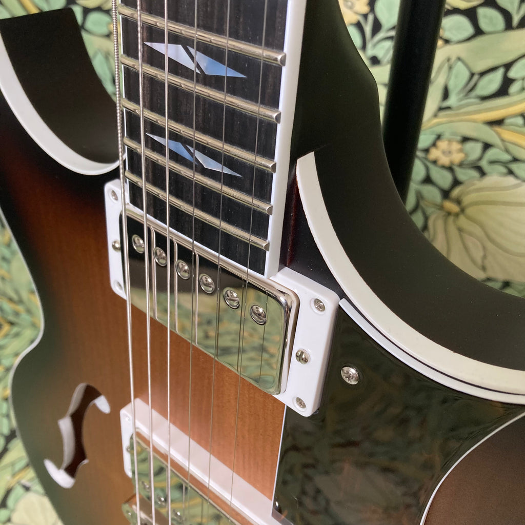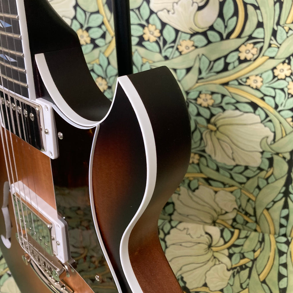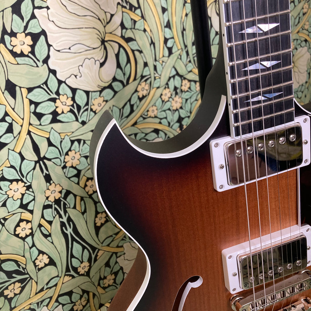 This semi-hollow stunner has a body constructed of mahogany, topped with a roasted maple cap, finished in nitro, and complemented by a comfy matching mahogany neck measuring 0.86" at the 1st fret and 0.92" at the 12th, with a 12" radius ebony fretboard featuring pearl split diamond inlays and a 1 11/16th" nut width. It weighs in at a breezy 6lbs 9oz.