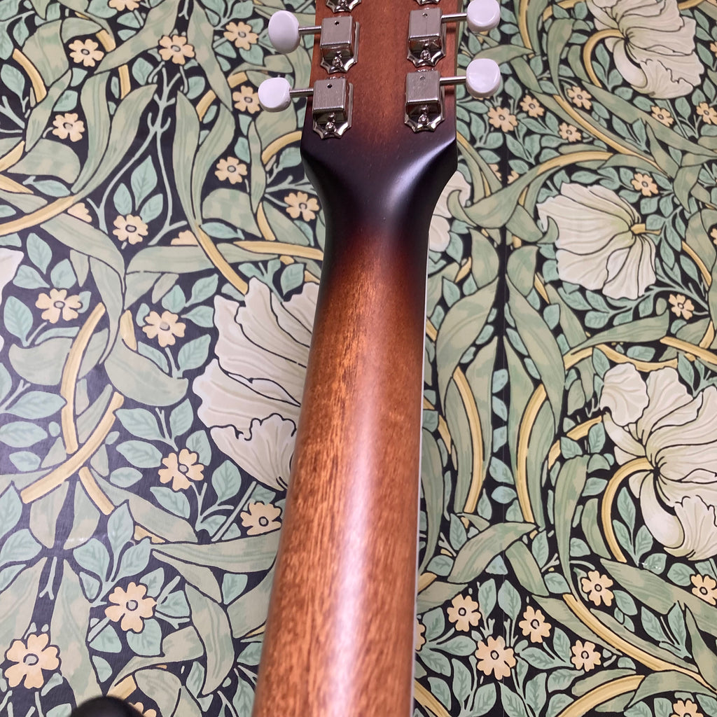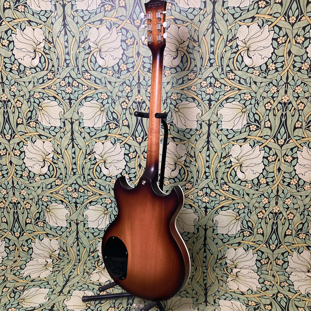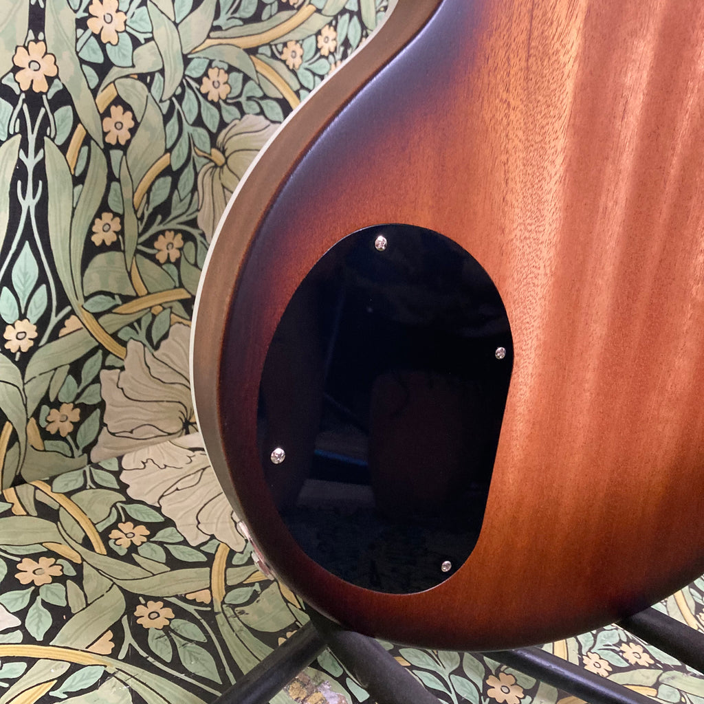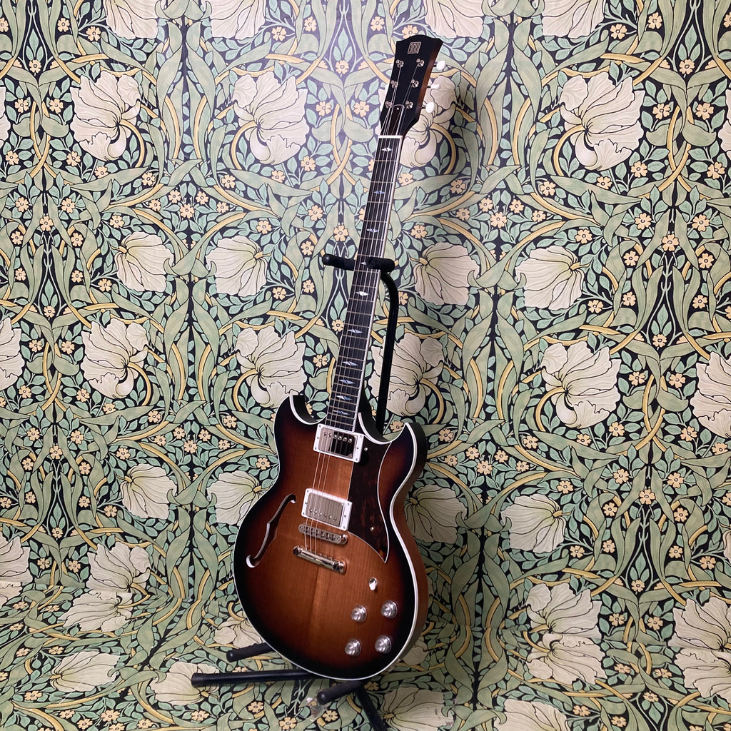 This semi-hollow stunner has a body constructed of mahogany, topped with a roasted maple cap, finished in nitro, and complemented by a comfy matching mahogany neck measuring 0.86" at the 1st fret and 0.92" at the 12th, with a 12" radius ebony fretboard featuring pearl split diamond inlays and a 1 11/16th" nut width. It weighs in at a breezy 6lbs 9oz.