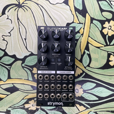 SuperKar+ is a Eurorack voice module that uses Karplus-Strong synthesis to create the sound of plucked or bowed strings, struck or blown pipes or tubes, or a suite of other sounds from percussive textures to legato melodies and chords with smart harmonies. This is Karplus-Strong synthesis at its most intuitive and captivating.