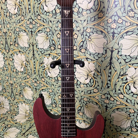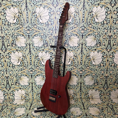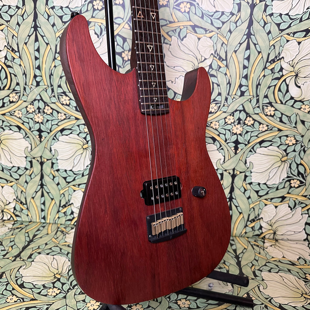 No need for a paint job, these woods are just too gorgeous. Let that baby breathe! The alder body is complemented nicely with a stunning padauk top, and the wenge C-profile neck is as comfortable as it is beautiful! It measures 0.88" at the 1st fret, and 0.880" at the 12th fret, and has a nut width of 1.625". The matching wenge fretboard has a 12" radius and features Valiant's signature trinity fretboard inlays.