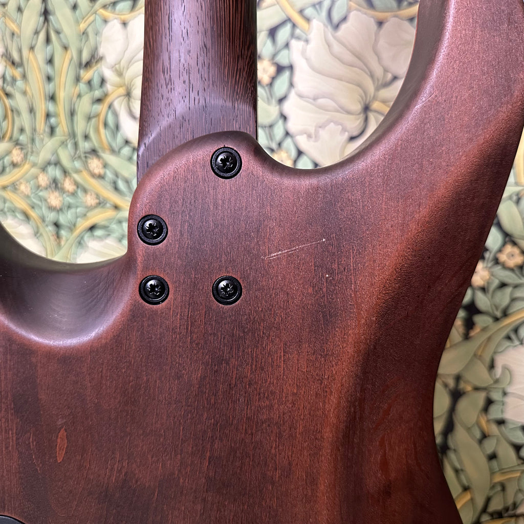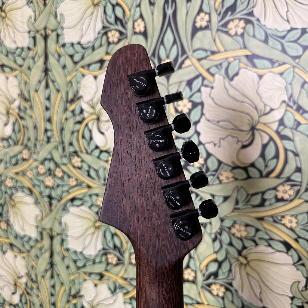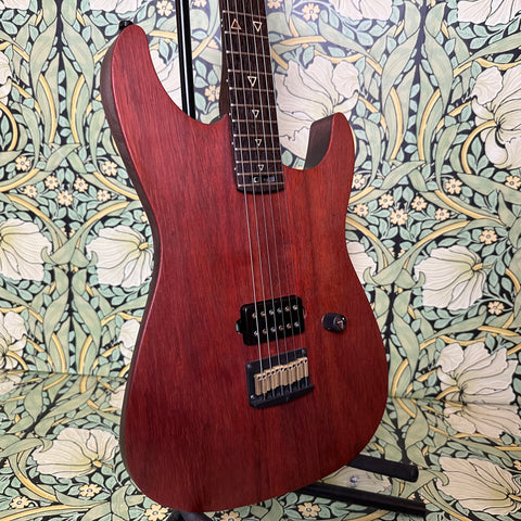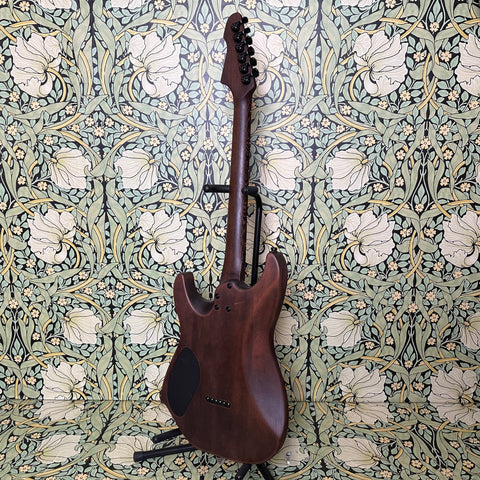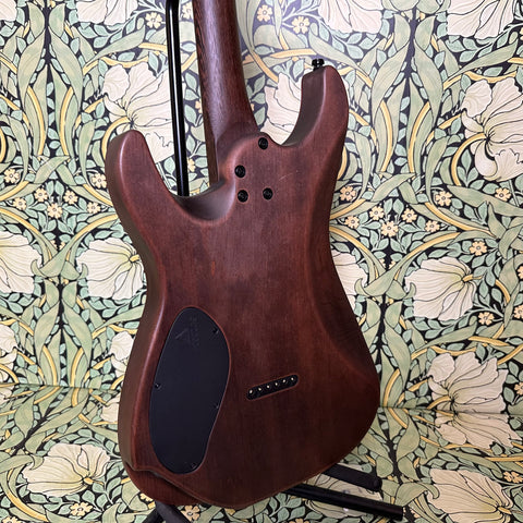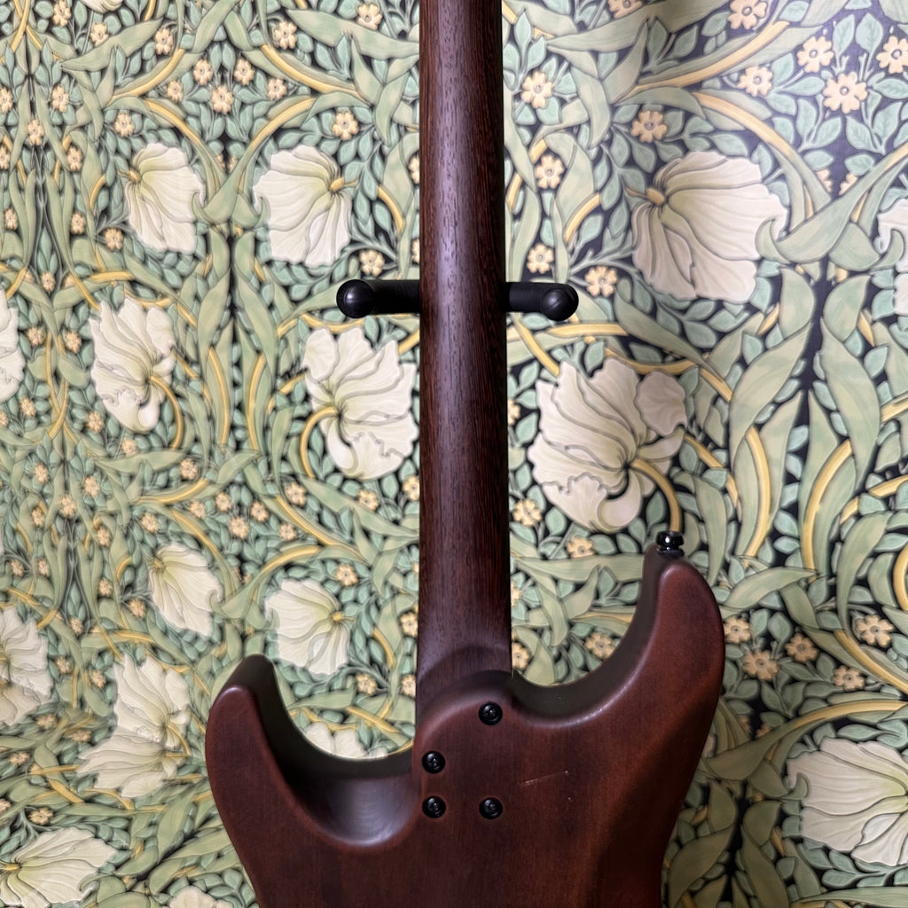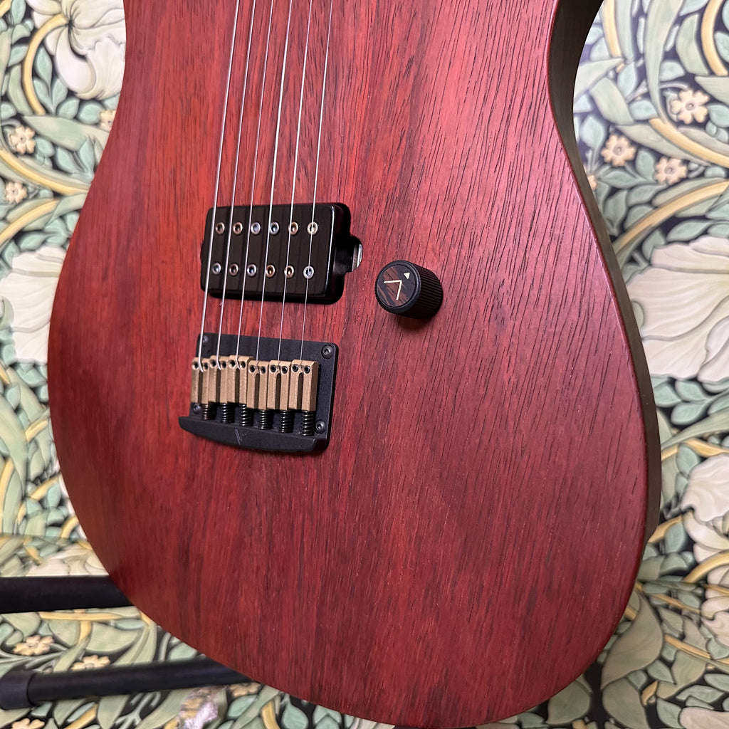 Let's talk about the guts in this baby. Electronics couldn't be more straightforward, just a volume knob. Who needs a tone knob? What, you want less tone? Get real! And top it off with a Bareknuckle War Pig in the bridge? Watch out front row, this thing breathes fire! Enough output power in that pup to send just about any amp into sweet overdriven bliss.