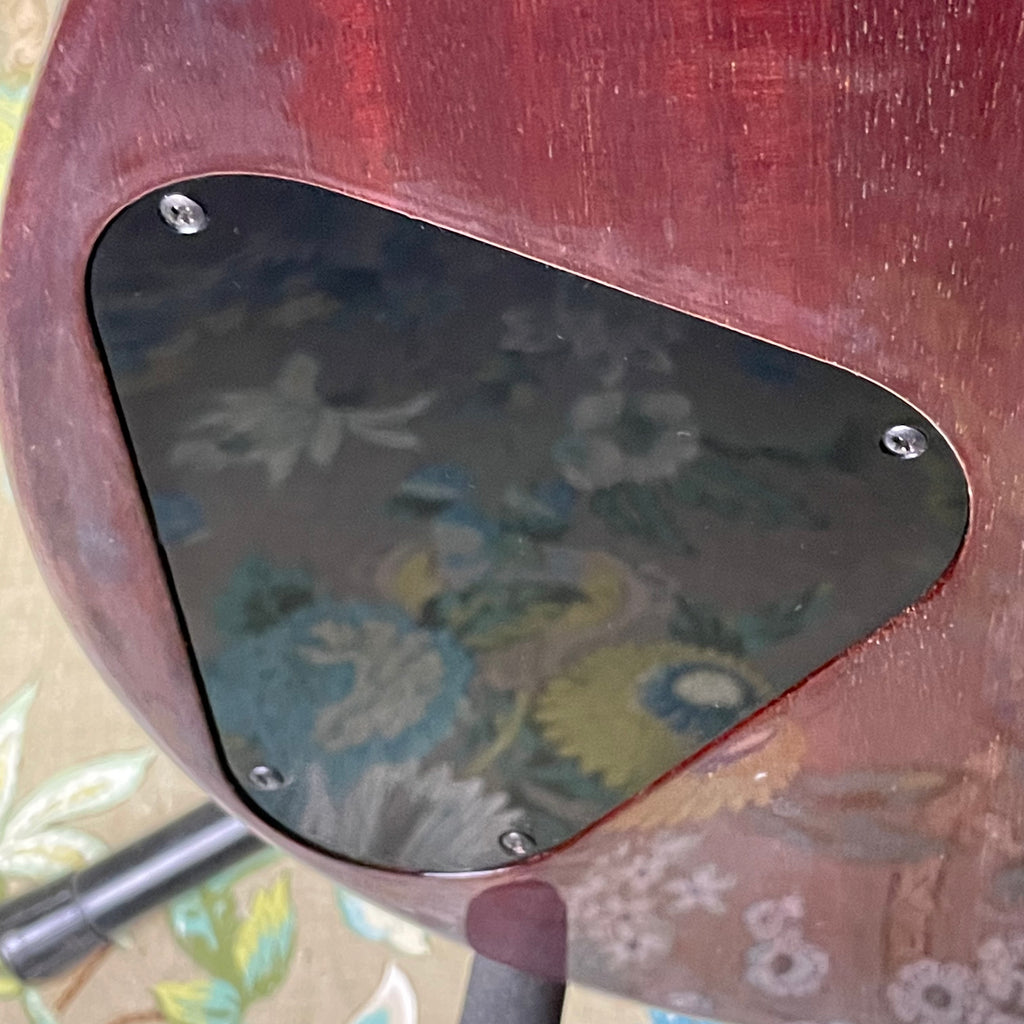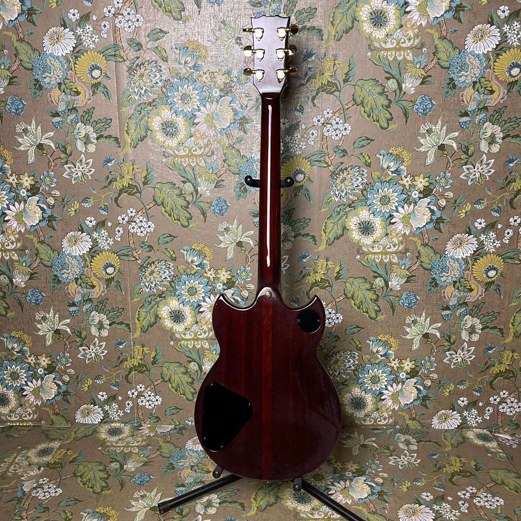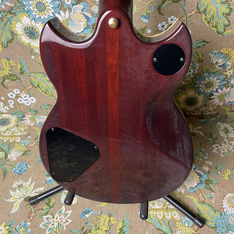 Crafted from mahogany body and maple top with a three piece mahogany C shape neck (.805"-.968"), this extra clean vintage piece has a beautiful ebony 12" radius fingerboard with a 1.69" nut width. Flip this thing around and you'll find a nice 'tummy cut" adding to the chances this guitar feels as nice as it plays.